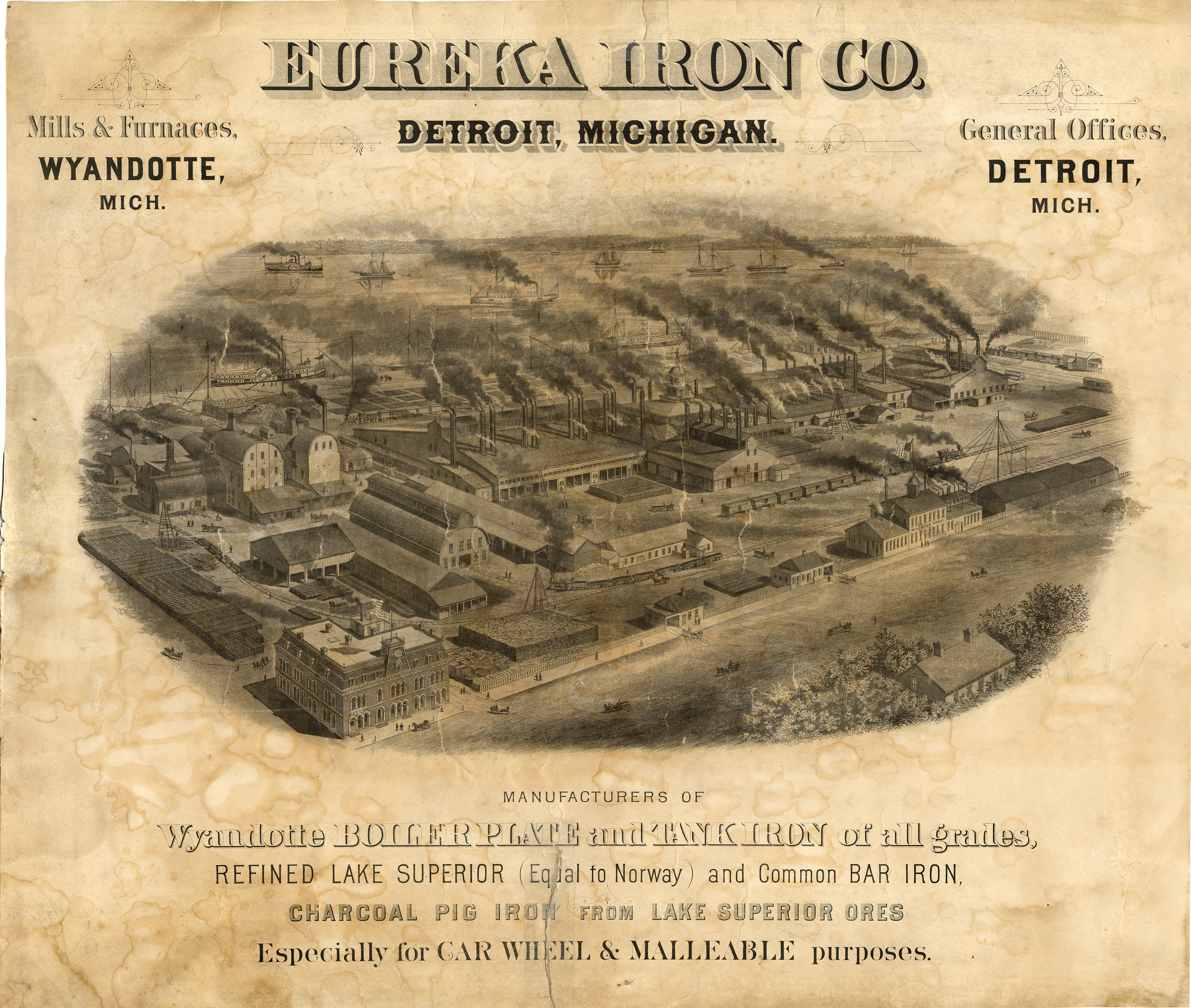 Advertisement for the Eureka Iron Co. depicting a bird's-eye view of the factory. Printed on front: "Eureka Iron Co., Detroit, Michigan. Mills & furnaces, Wyandotte, Mich. General offices, Detroit, Mich. Manufacturers of Wyandotte boiler plate and tank iron of all grades, refined Lake Superior (equal to Norway) and common bar iron. Charcoal pig iron from Lake Superior ores. Especially for car wheel & malleable purposes."