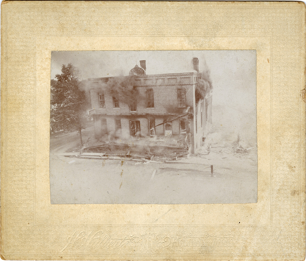 View of the fire at the National Hotel in Armada, Michigan. Embossed on front: "H. Hulbert, Armada, Mich."