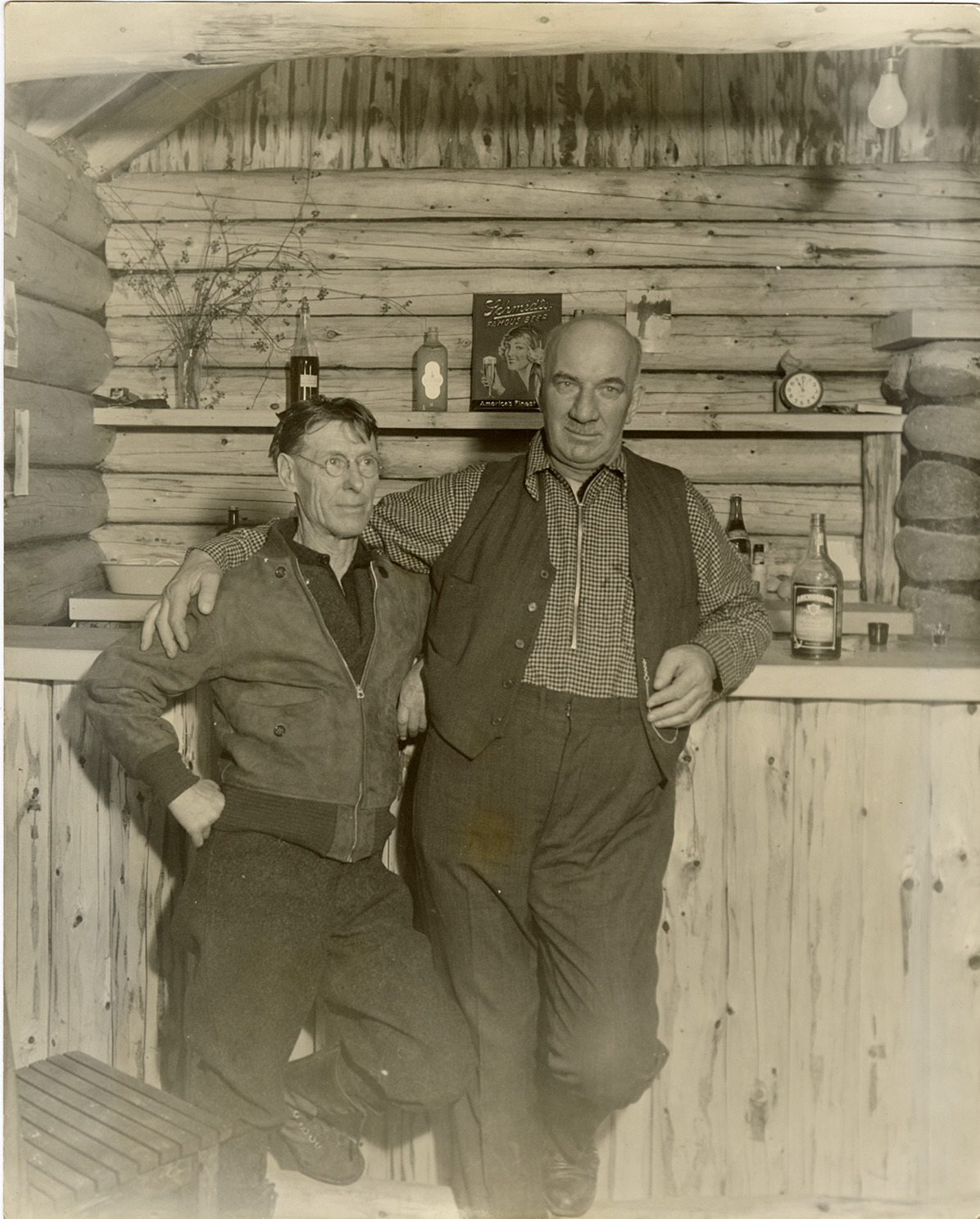 View of William Blackburn and Thomas Piepkorn posing in front of bar at Doctor's Hunting Club in Alpena, Michigan. Handwritten on back: "William A. Blackburn, Pres., Leroy; Richard W. Piepkorn, Pres., Doctor's at Doctor's Hunting Club, 1934. Joint communication both clubs. Frame probably by Walter Hayden."