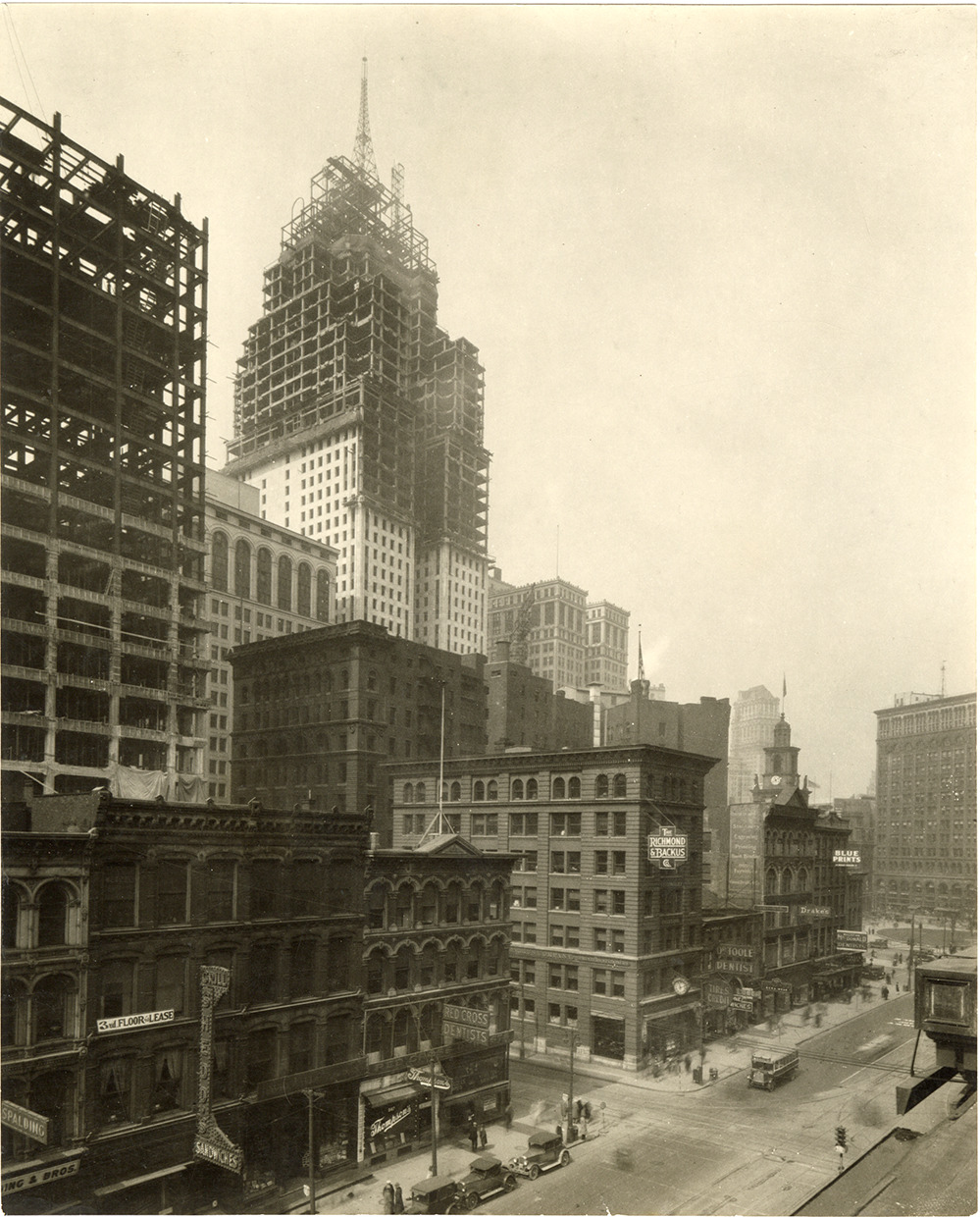 Favorite this☆ Penobscot Building during construction Description: View of the Penobscot Building during construction. Commercial buildings and businesses in foreground, including the Richmond & Backus Co., Drake's, Red Cross Dentists and Thompson's. Details Resource ID: bh030125 Subject: Office buildings--Michigan--Detroit--Design and construction Commercial buildings--Michigan--Detroit Photographic prints Date Issued: Unknown year Format: 1 photographic print ; 8.25 x 6.75 in. Member of: Burton Historical Collection Filing Location: D/Buildings-Penobscot Rights: Physical rights are retained by DPL. Copyright is retained in accordance with U.S. copyright laws.