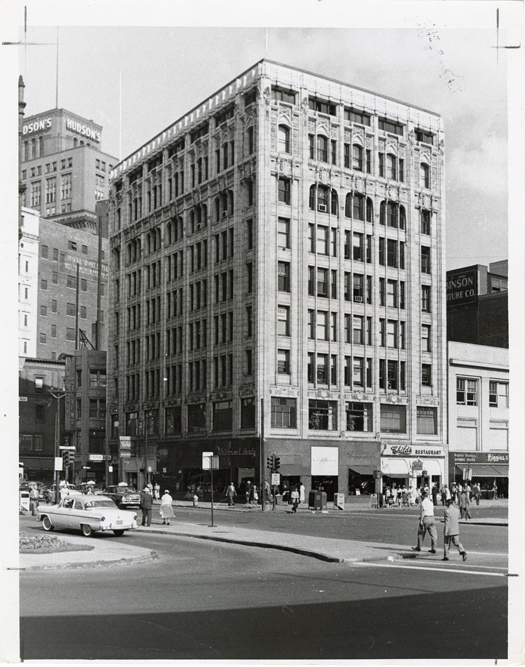 View of the Empire Building. Pedestrians in foreground. Stamped on back: "Aug 11, 1957." Handwritten on back: "This bldg., completed in 1908, became the Empire Bldg. in 1917 when the gas company moved to Clifford & Bagley."
