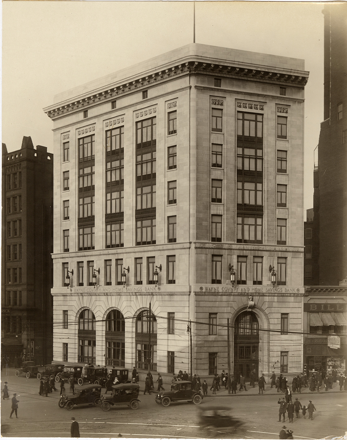 Favorite this☆ Wayne County and Home Savings Bank Description: View of pedestrians and automobiles in front of the Wayne County and Home Savings Bank. Details Resource ID: bh030156 Subject: Bank buildings--Michigan--Detroit Photographic prints Date Issued: Unknown year Format: 1 photographic print mounted on fabric ; 9.5 x 7.5 in. Member of: Burton Historical Collection Filing Location: D/Banks-Wayne County and Home Savings Rights: Physical rights are retained by DPL. Copyright is retained in accordance with U.S. copyright laws.