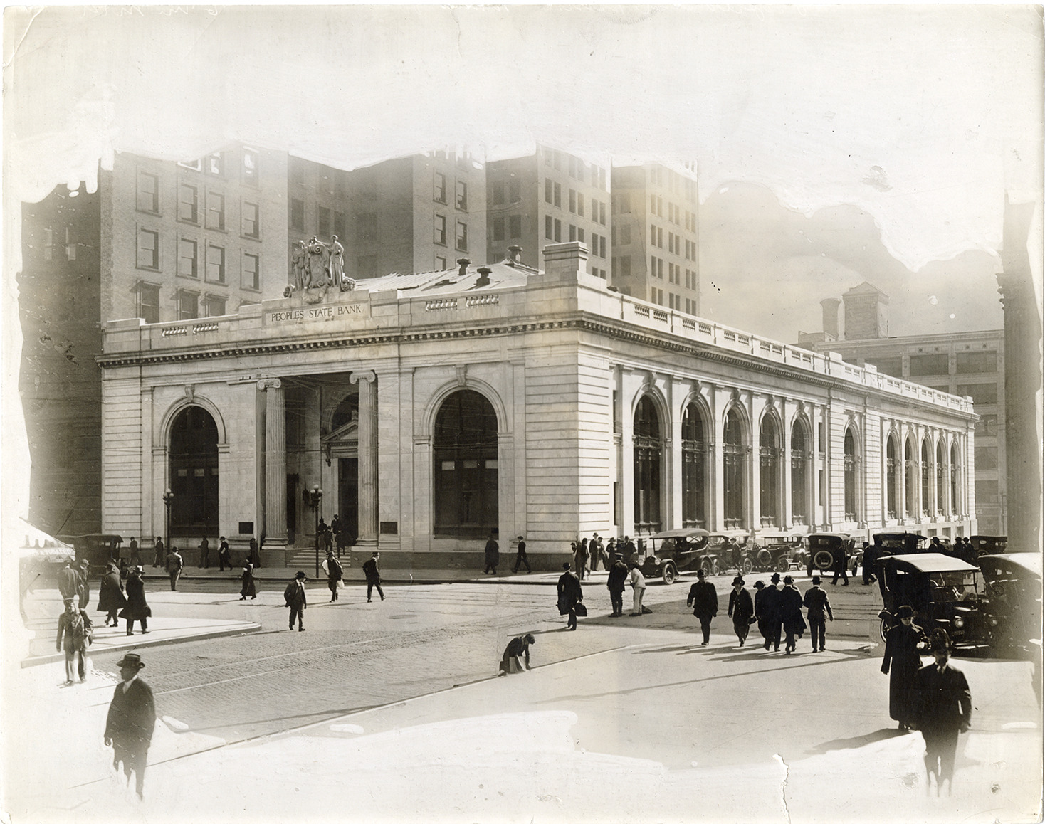 View of pedestrians and automobiles in front of the Peoples State Bank, located at West Fort and Shelby Streets. Label on back: "Peoples State Bank Building." Stamped on back: "Manning Bros., commercial photographers, 22-24 Witherell St., Detroit, Michigan." Handwritten on back: "W. Fort & Shelby Sts., S.E. cor."