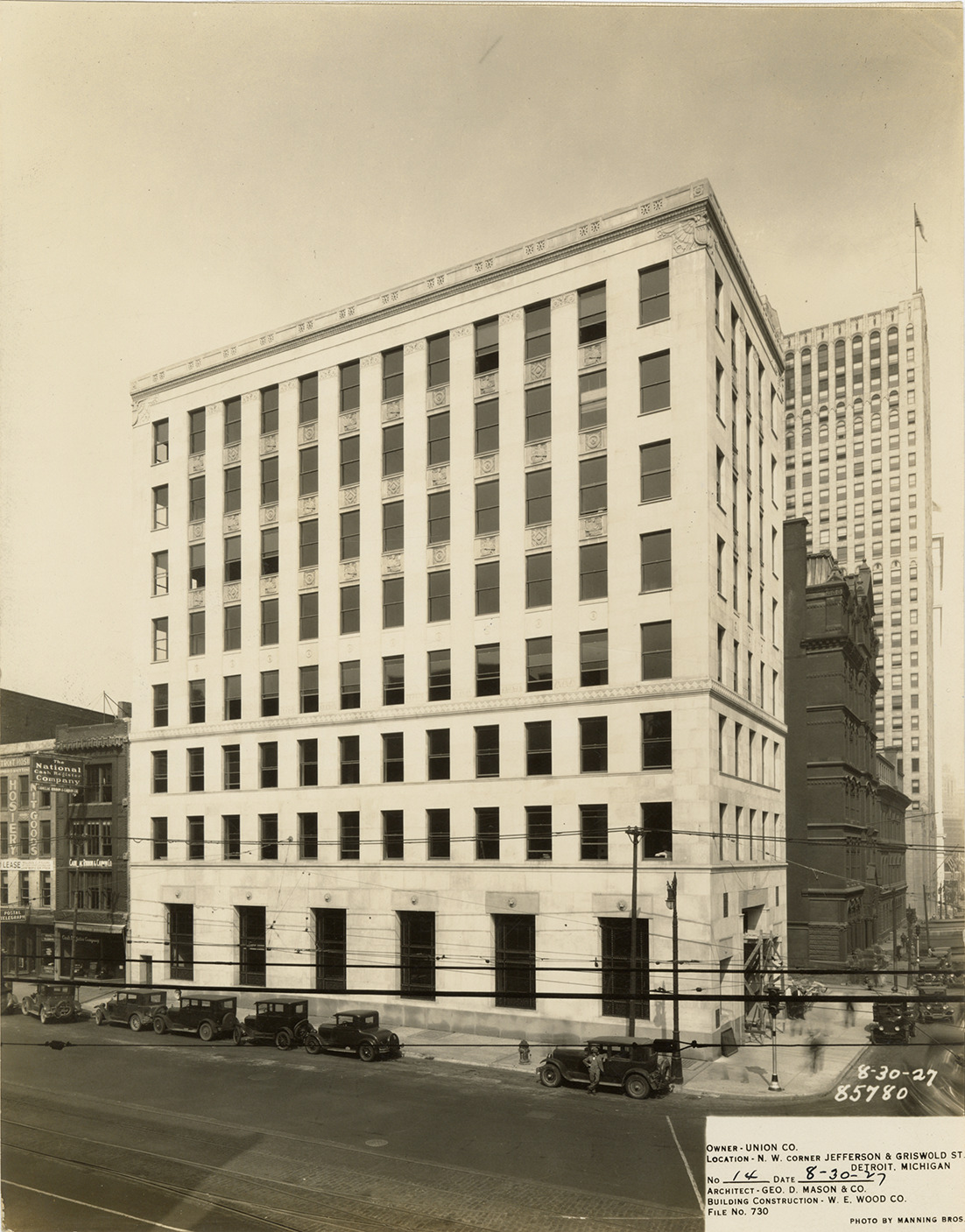 View of the Standard Federal Savings and Loan building during construction, showing some scaffolding at entrance. Printed on front: "8-30-27, 85780. Owner: Union Co. Location: N.W. corner Jefferson & Griswold St., Detroit, Michigan. No. 14. Date: 8-30-1927. Architect: Geo. D. Mason & Co. Building construction: W.E. Wood Co. File no. 730. Photo by Manning Bros."