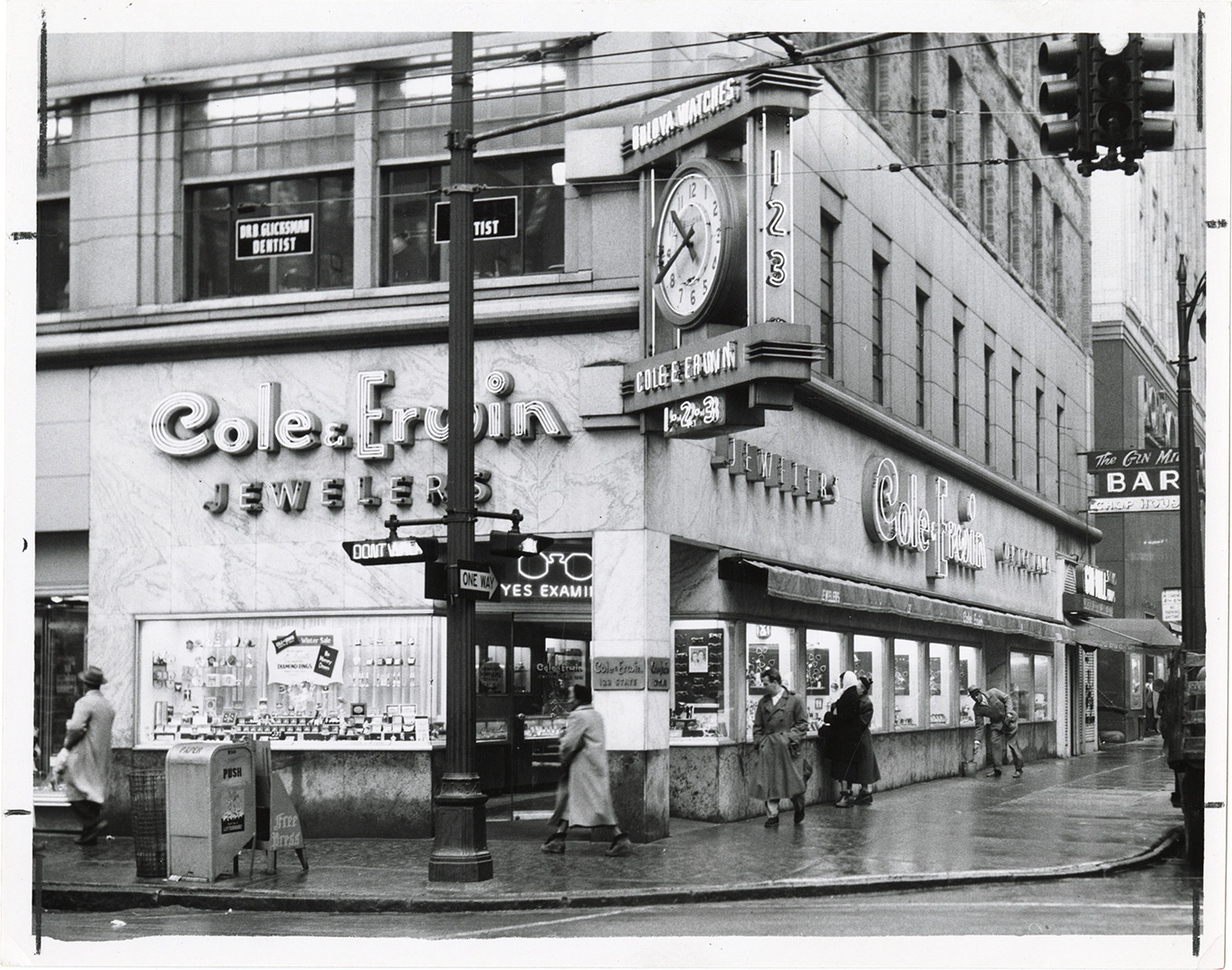 View of pedestrians in front of the Cole & Erwin jewelers store, located at the corner of State St. and Griswold. Store has display windows. Neon sign reads: "Cole & Erwin, jewelers." Clock is displayed over entrance. Stamped on back: "Free Press photo, Jan 21, 1957."