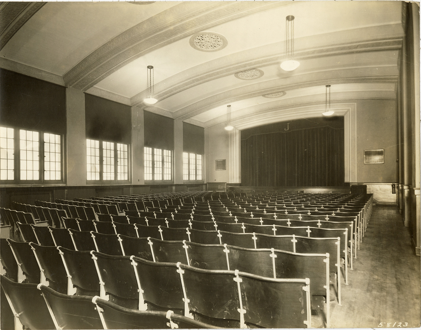 View of the auditorium at the Jefferson Intermediate School. Rows of seats in foreground; stage in background. Stamped on back: "Manning Bros., commercial photographers. 504-505 Lincoln Building. Corner State and Park Sts., Detroit, Mich." and "Malcomson & Higginbotham, 6th floor, Industrial Bank Bldg., 1217 Griswold St., Detroit, Mich." Typed on back: "Jefferson Intermediate School, auditorium." Handwritten on back: "Jefferson Intermediate School, auditorium."