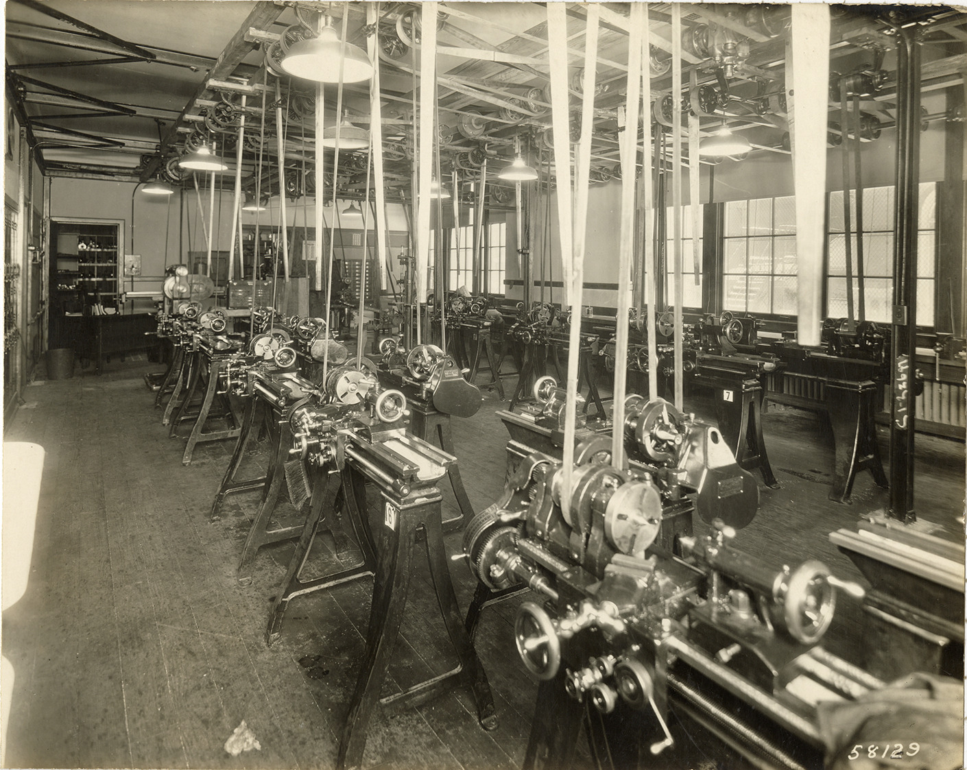 View of the machine shop at the Jefferson Intermediate School, showing rows of machines. Stamped on back: "Manning Bros., commercial photographers. 504-505 Lincoln Building. Corner State and Park Sts., Detroit, Mich." and "Malcomson & Higginbotham, 6th floor, Industrial Bank Bldg., 1217 Griswold St., Detroit, Mich." Typed on back: "Jefferson Intermediate School, machine shop." Handwritten on back: "Jefferson Intermediate School, machine shop."