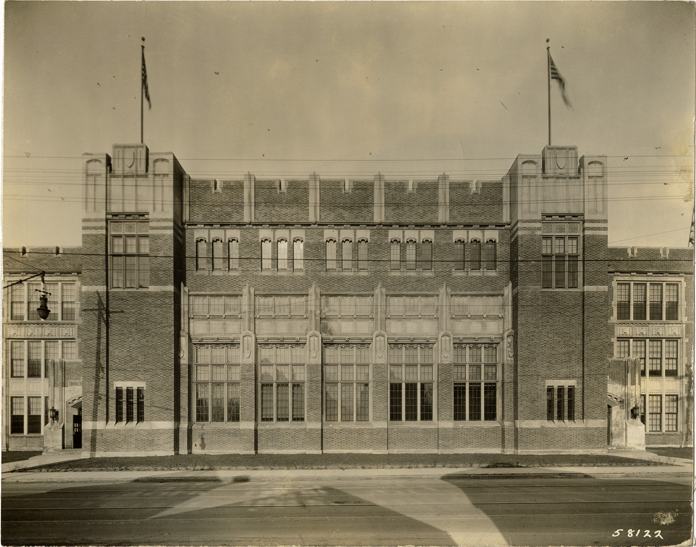 View of Jefferson Intermediate School. Stamped on back: "Manning Bros., commercial photographers. 504-505 Lincoln Building. Corner State and Park Sts., Detroit, Mich." and "Malcomson & Higginbotham, 6th floor, Industrial Bank Bldg., 1217 Griswold St., Detroit, Mich." Handwritten on back: "Jefferson Intermediate School, central bay."