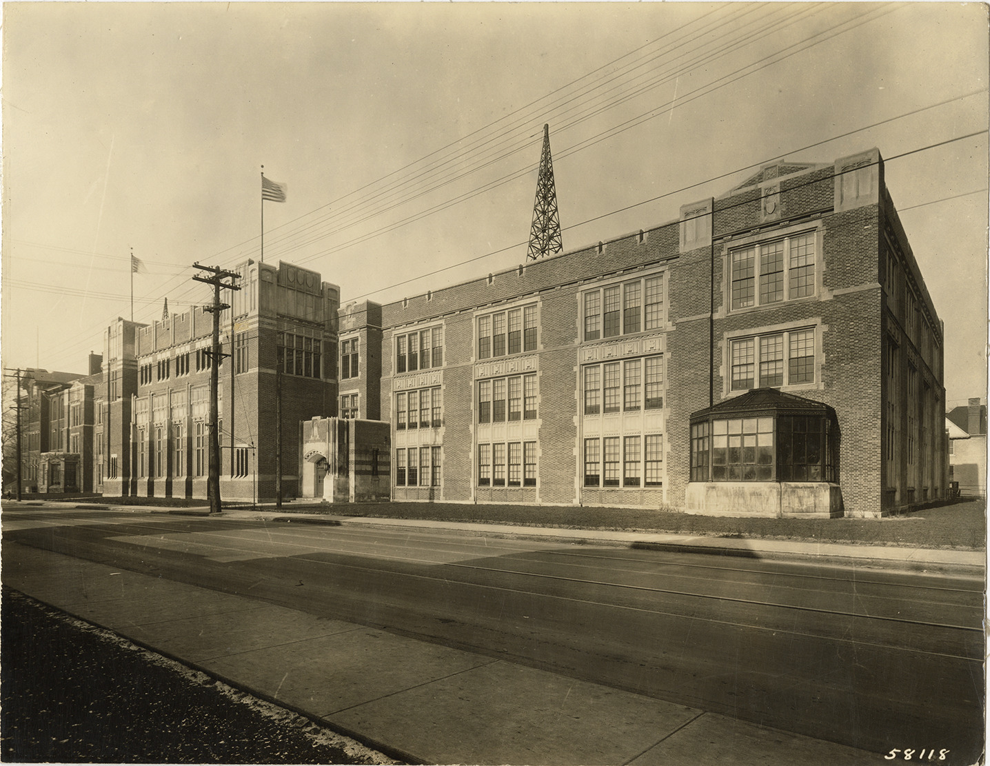 View of the Jefferson Intermediate School. Stamped on back: "Manning Bros., commercial photographers. 504-505 Lincoln Building. Corner State and Park Sts., Detroit, Mich." and "Malcomson & Higginbotham, 6th floor, Industrial Bank Bldg., 1217 Griswold St., Detroit, Mich." Handwritten on back: "Jefferson Intermediate School."
