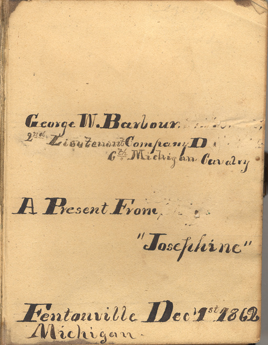 Dedication from leather carte de visite album of Barbour family. Handwritten text reads: "George W. Barbour, 2nd lieutenant Company D, 6th Michigan Cavalry, a present from Josephine, Fentonville, Michigan, Dec. 1st, 1862."