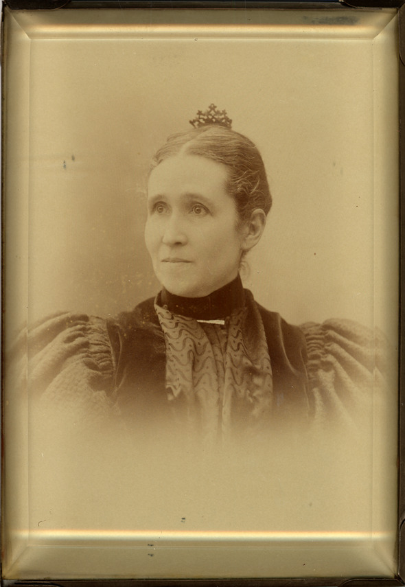 Print on paper under solid glass in metal, spring-held frame of Ida Frumveller. Back of frame: "The Gale Glass Mount, Bristol, Conn. , Huntington & Clark, leading photographers (successors to Millard), 224-226 Woodward Ave., Detroit, Mich., our motto: 'Beauty of pose and excellence of finish.' We hold exclusive right of this patent process for Detroit and vicinity."