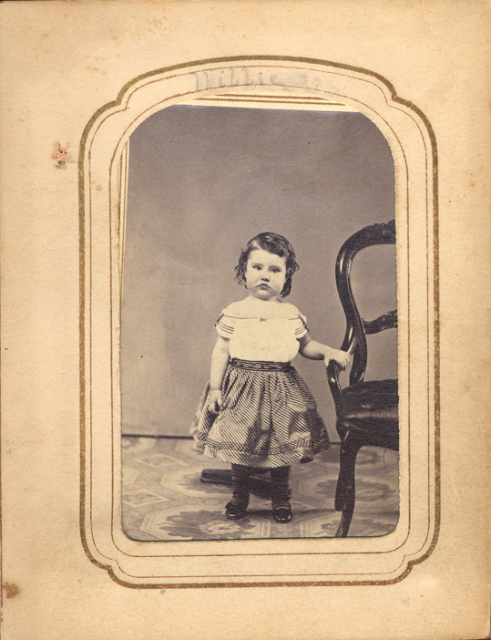 Portrait of Willie Barbour, son of Lieutenant George W. Barbour, posing next to chair. Handwritten on front: "Willie."