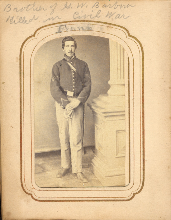 Portrait of Corporal Frank Barbour, brother of Lieutenant George W. Barbour, posing next to column. Frank Barbour served in the 5th Michigan Cavalry Regiment, Company A. Handwritten on front: "Frank. Brother of G.W. Barbour killed in Civil War."
