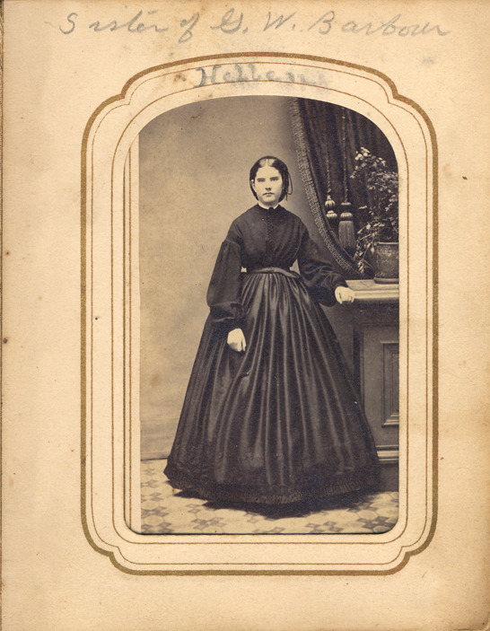 Portrait of Hellen Barbour, sister of Lieutenant George W. Barbour, posing next to mantel. Handwritten on front: "Hellen. Sister of G.W. Barbour."
