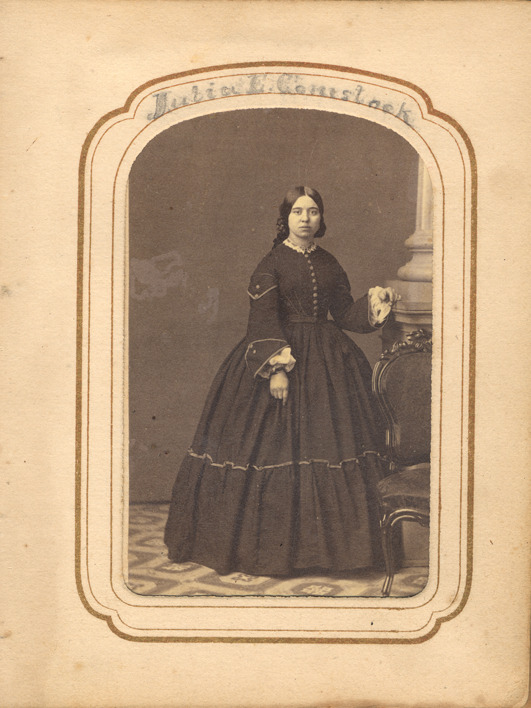 Portrait of Julia E. Comstock, posing next to column. Handwritten on front: "Julia E. Comstock."