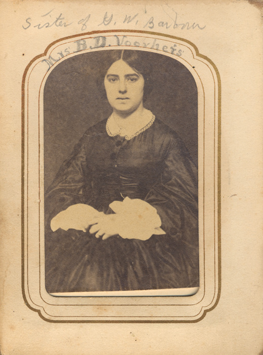 Portrait of Mrs. B.D. Voorheis, sister of Lieutentant George W. Barbour. Handwritten on front: "Mrs. B.D. Voorheis, sister of G.W. Barbour."