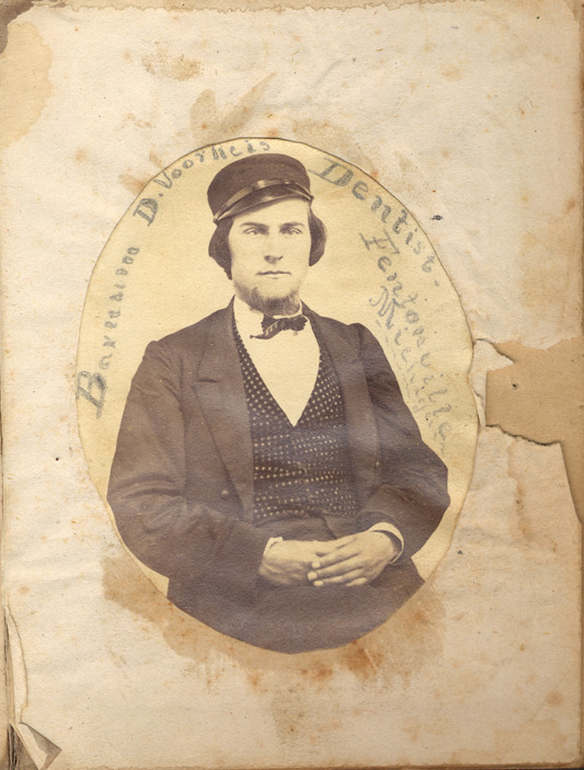 Portrait of B.D. Voorheis, dentist in Fentonville, Michigan. Handwritten on front: "B ... D. Voorheis, dentist, Fentonville, Michigan."