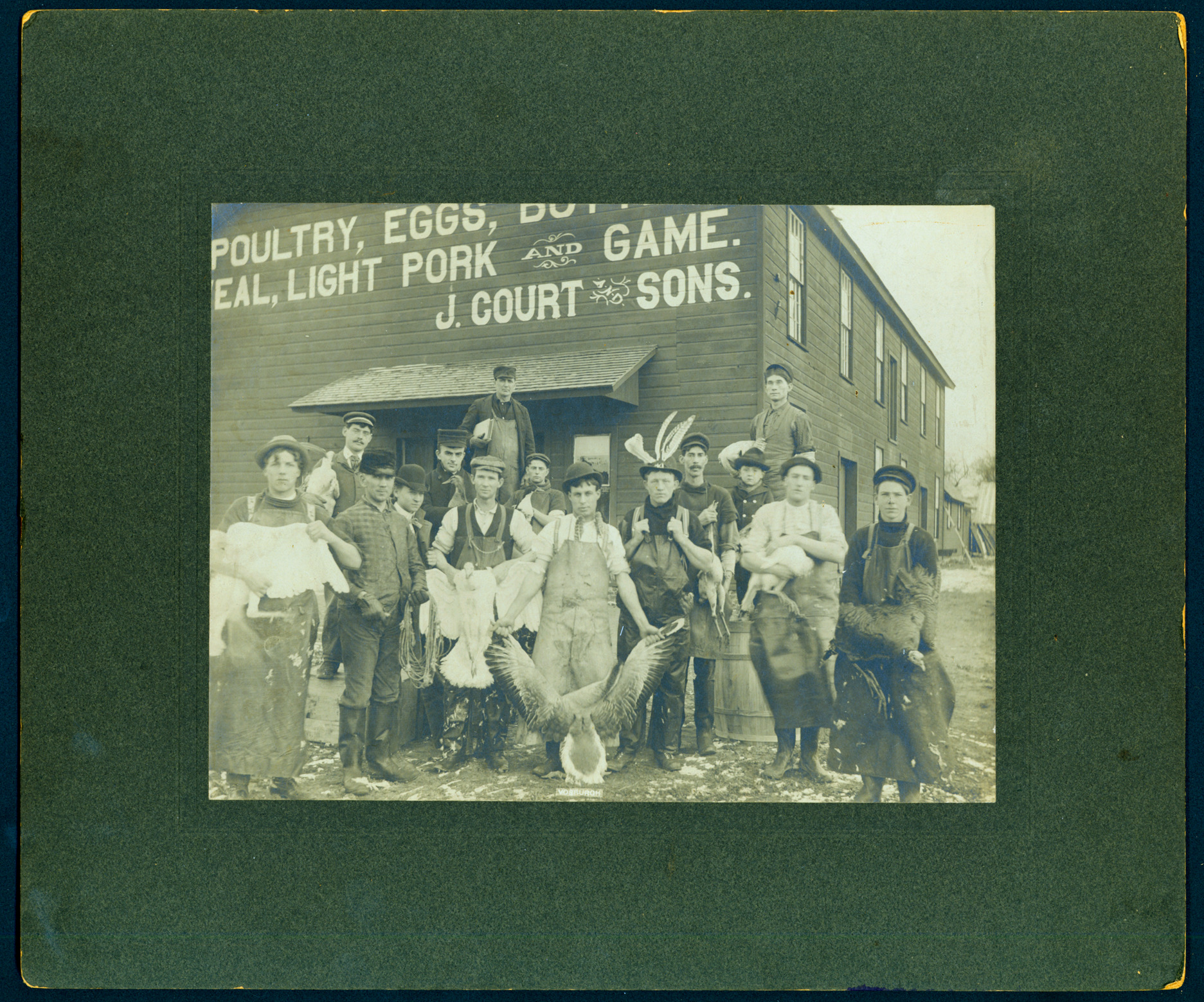 Group of fourteen men and boy displaying poultry in front of farm business with a partial sign reading, "Poultry, eggs, light pork and game. J. Court & Sons." Handwritten on back: "Lewis, Bates, Vahur, Wise, Pulsipher, Sneed, Ellinger, Balt, H. Vahurs, Rob Vahurs, ... , Ted Cook.