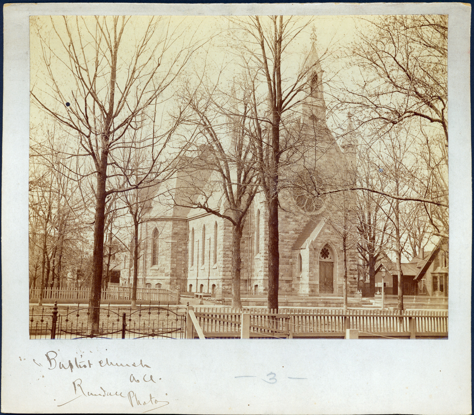 First Baptist Church in Ann Arbor; the church has Gothic features that include tall slender lancet windows, arches, and buttresses. Written on photo front: "Baptist church A.A., Randall Photos."