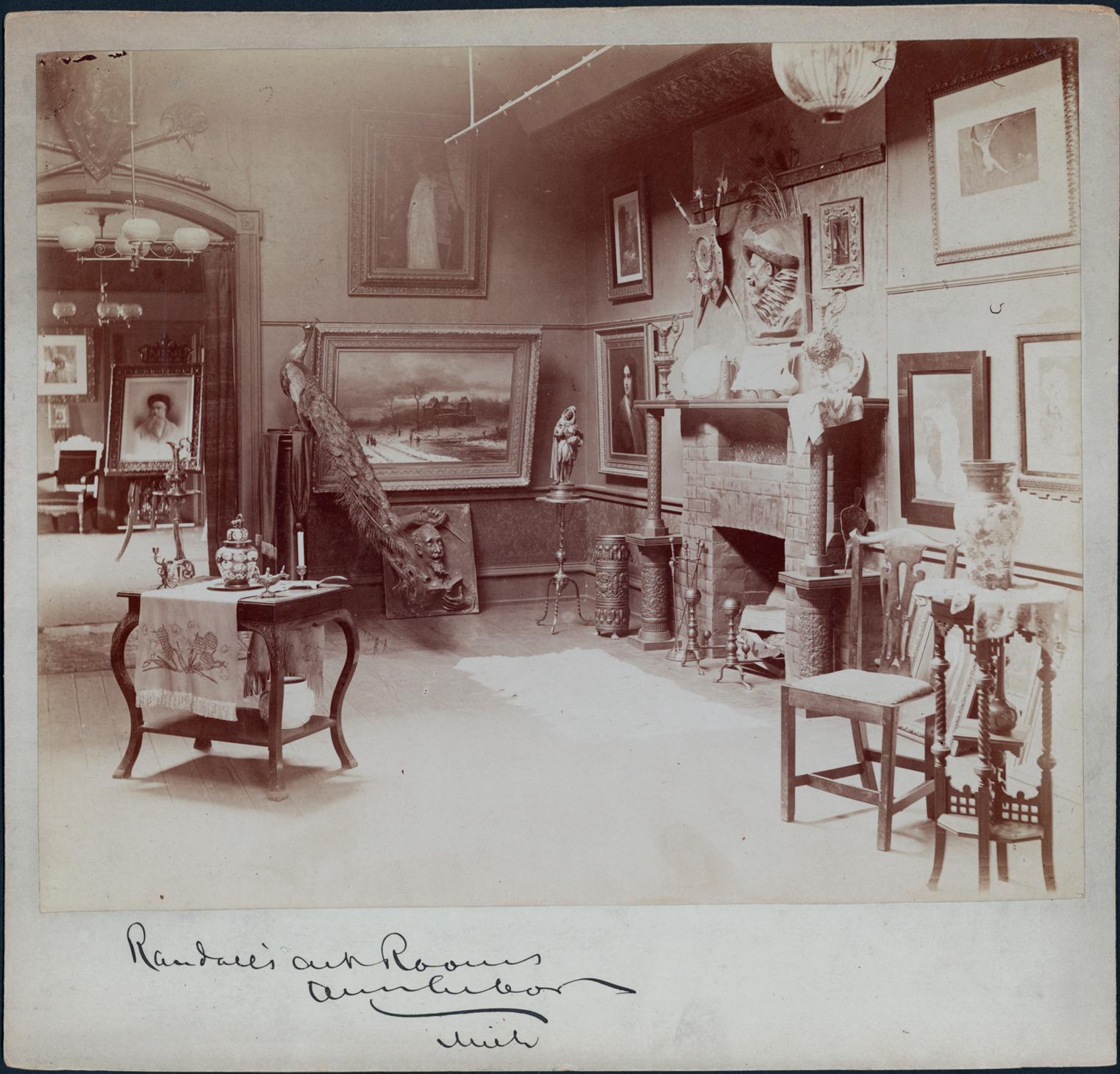 View of Randall's Art Room with framed pictures, statues, a stuffed peacock, vases and assorted decorative items sitting on top of fireplace. Gas light projecting above fireplace and upper left side. Written on photo front: "Randall's Art Rooms, Ann Arbor, Mich."