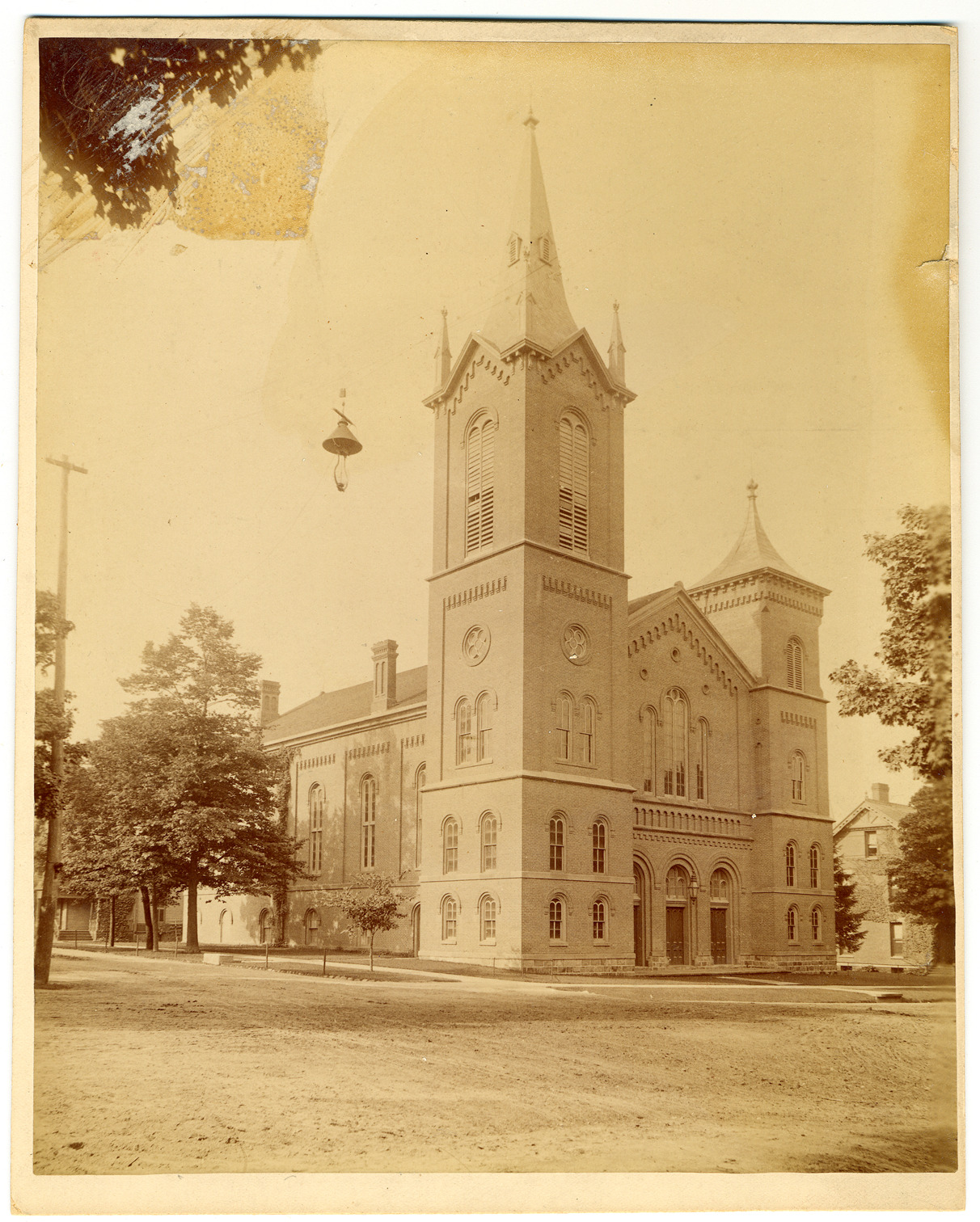 View of the First Presbyterian Churh in Ann Arbor located between Huron and Division Streets, a street light hanging on wires in the middle of the road. Damage near the upper left side of the photo. Written on photo back: "Presbyterian Church."