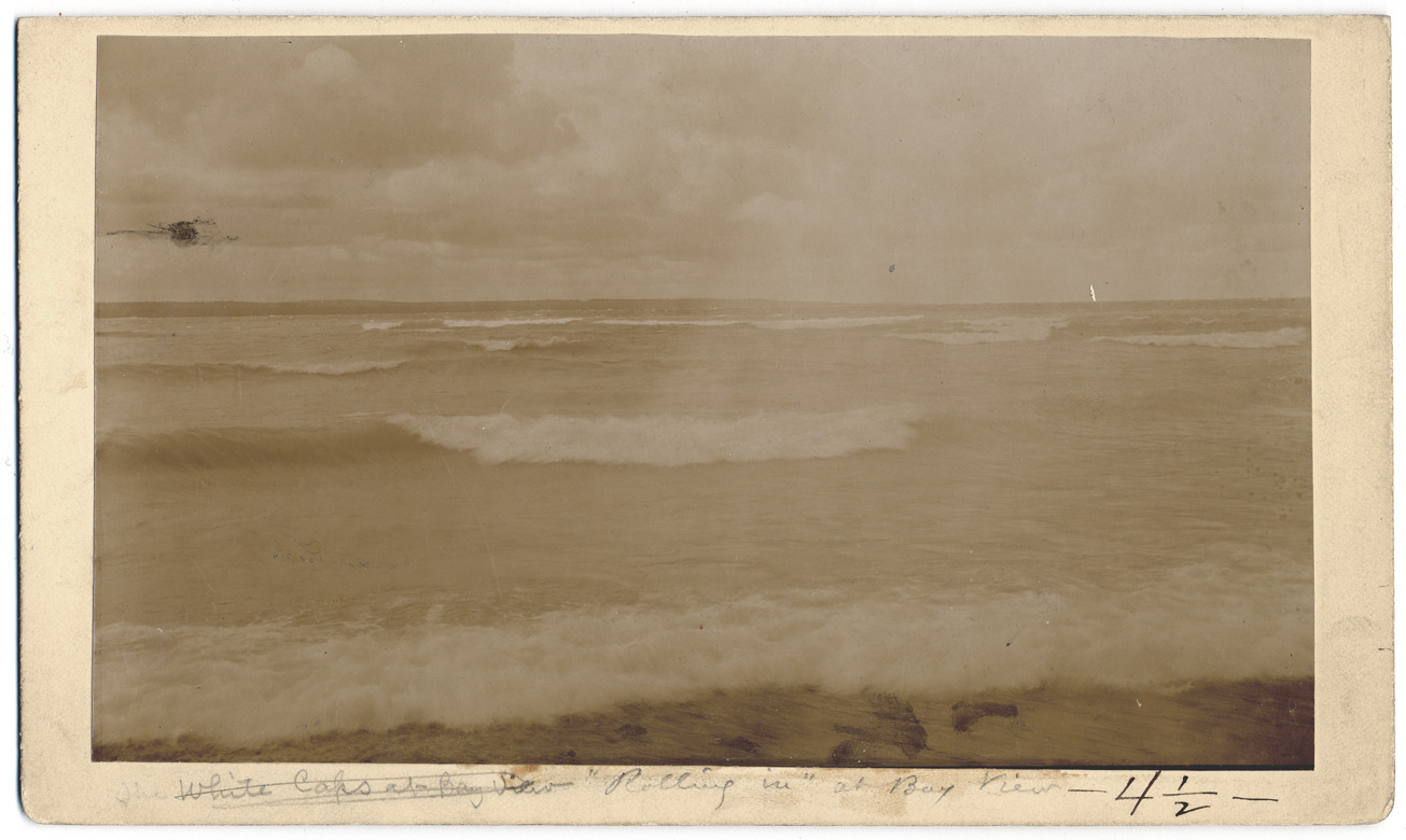 Favorite this☆ Waves breaking onto the shore at Bay View Description: Waves breaking onto the shore at Bay View. Dark deposit on photograph, and whitecaps enhanced. Handwritten on mat front: "White caps at Bay View (crossed out) 'Rolling in' at Bay View." Details Resource ID: DPA0061 Subject: Bay View (Mich.) Little Traverse Bay (Mich.) Albumen prints Photographic prints Date Issued: Unknown year Format: 1 photographic print mounted on mat board ; image 4.5 x 7.5 in. Member of: Burton Historical Collection Filing Location: M/Localities-Bay View Rights: Physical rights are retained by DPL. Copyright is retained in accordance with U.S. copyright laws.