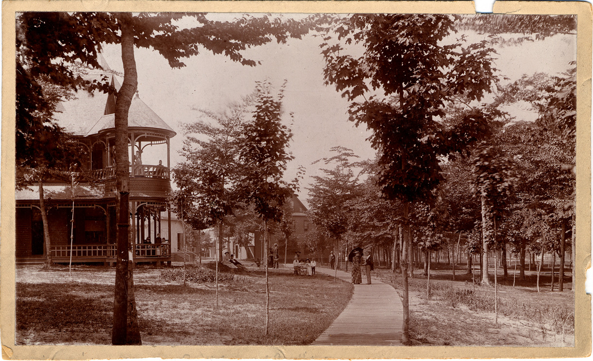 Summer University buildings with sidewalk curving through park with trees; woman with parasol and man standing on sidewalk mid-scene with several other people sitting and standing in grounds and on porches. Handwritten on back: "839 - University Hall and Park Scene - From Charles L. Clark Estate."