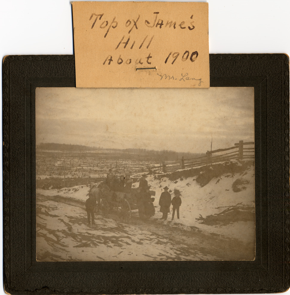 Several people on and around horse-drawn wagon against patchy snow; split-rail fence across top of hill. Embossed black mat. Handwritten on cardstock label stapled to mat front: "Top of Jame's Hill, About 1900-Mr. Lang." Handwritten on back: "Top of James Hill about 1900; Mrs. Lange, 110 W. Wheaton."