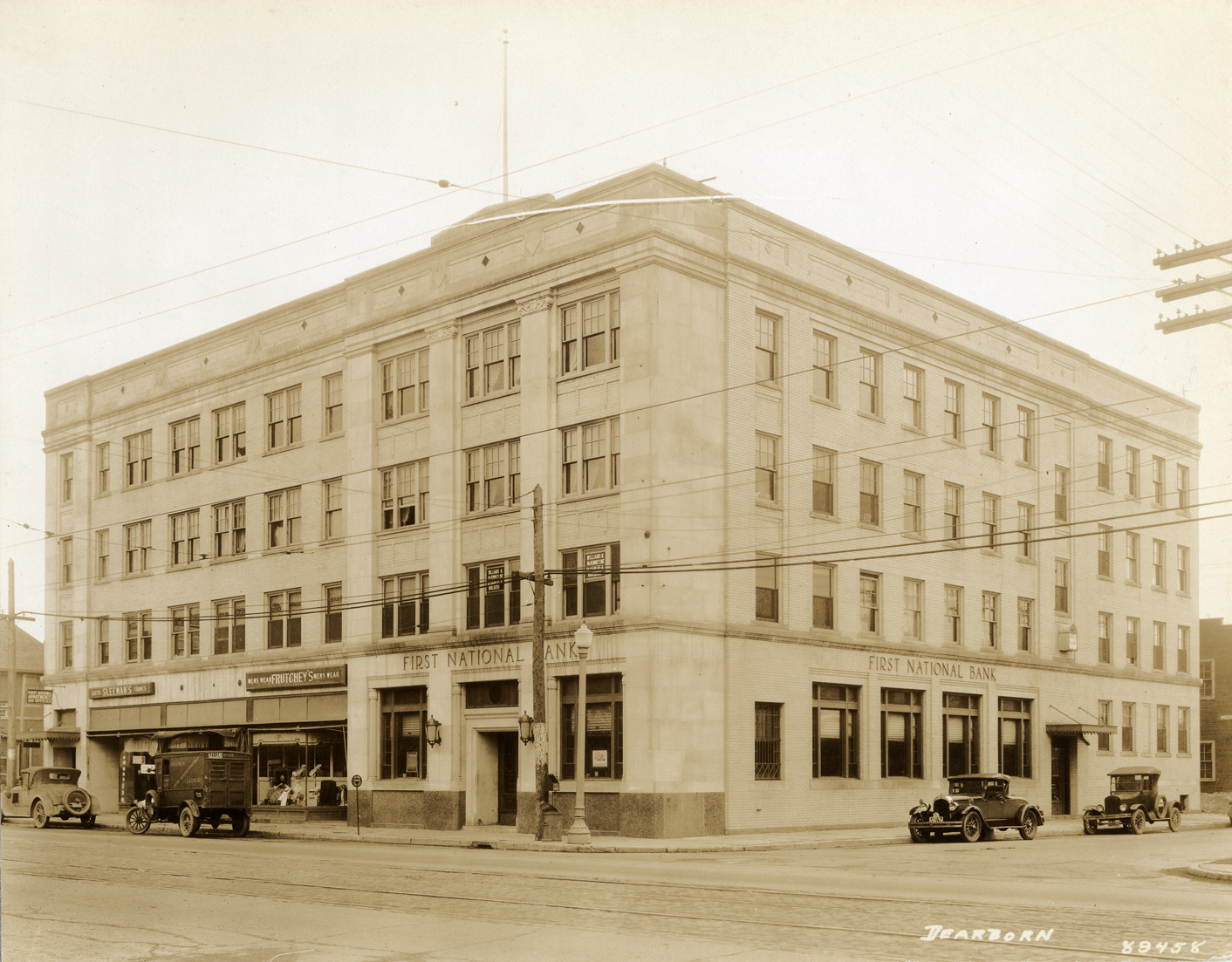 First National Bank building, with Frutchey's men's wear and Sleeman's gift and frame stores; sign on far left says "First National apartments and offices"; cars and delivery van visible on street. Handwritten on photograph front: "Dearborn - 89458."