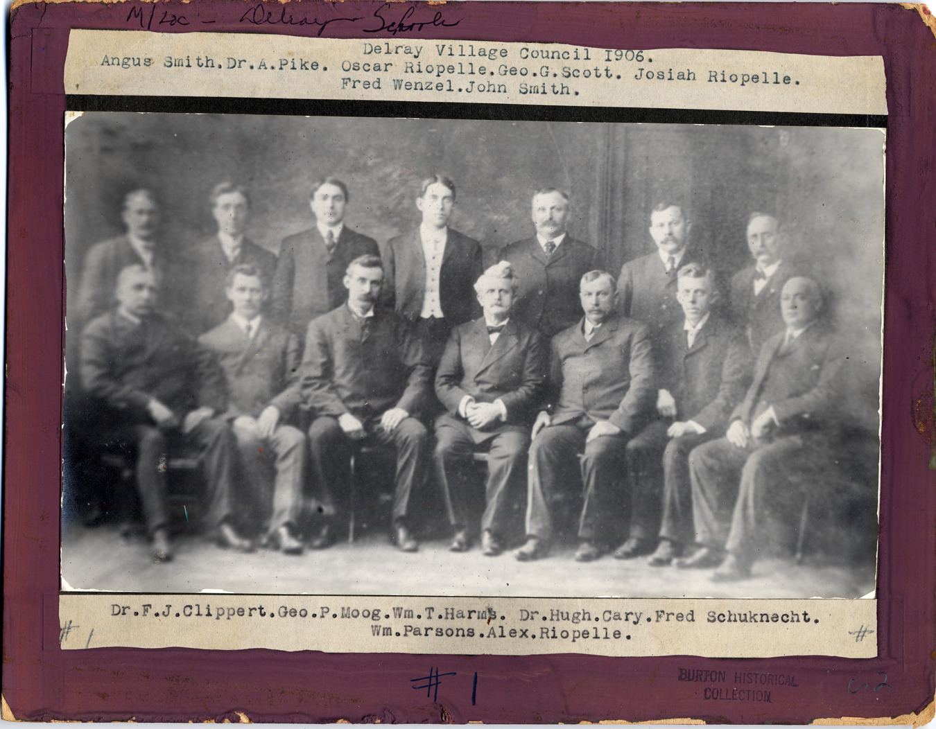 Portrait of the last village council serving Delray. Typed on labels on mat front: "Members of last Village Council of Delray. Mich., Top L. to R. Angus Smith, Dr. A. Pike, Oscar Riopelle, treas., Geo. G. Scott, Josiah Riopelle, Fred Wenzel, John Smith, Bottom R. Dr. F.J. Clippert, Geo. P. Moog, clerk, Wm. T. Harms, Dr. Hugh Cary, pres., Fred Schuknecht, Alex Riopelle."