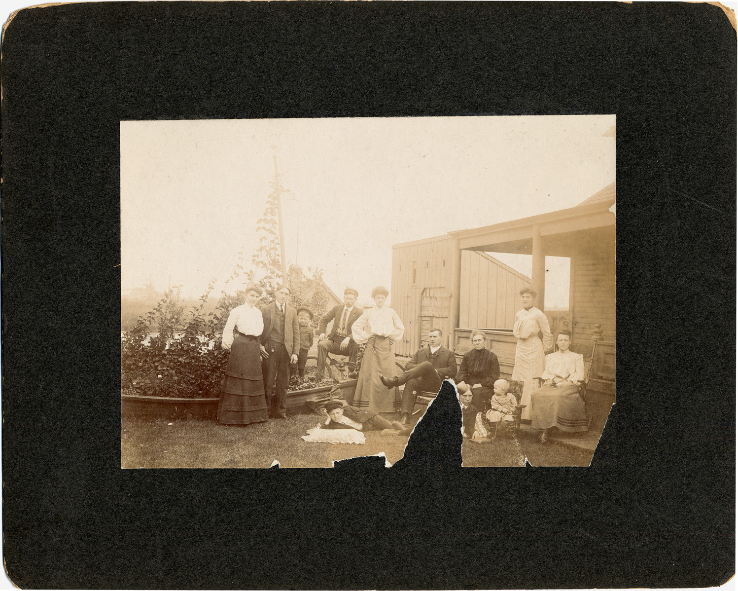 Members of family in back of house along the Detroit River. Photograph torn. Typed on label on back: "Photo taken in the back yard of home on River Road, with Zug Island in background, on the occasion of a visit of Mr. Schlee's (Dad) brother from Cleveland, O. accompanied by his wife and daughter. Left to right: Sylvia, Andrew, Dewey and Henry Schlee, Mrs. George Schlee (standing), Mr. George Schlee (from Cleveland) (sitting) as well as Mrs. Henry Schlee, baby Earl and George's daughter. Standing by porch- Rena B., Harry and Edward are on ground. 1903 Photo."