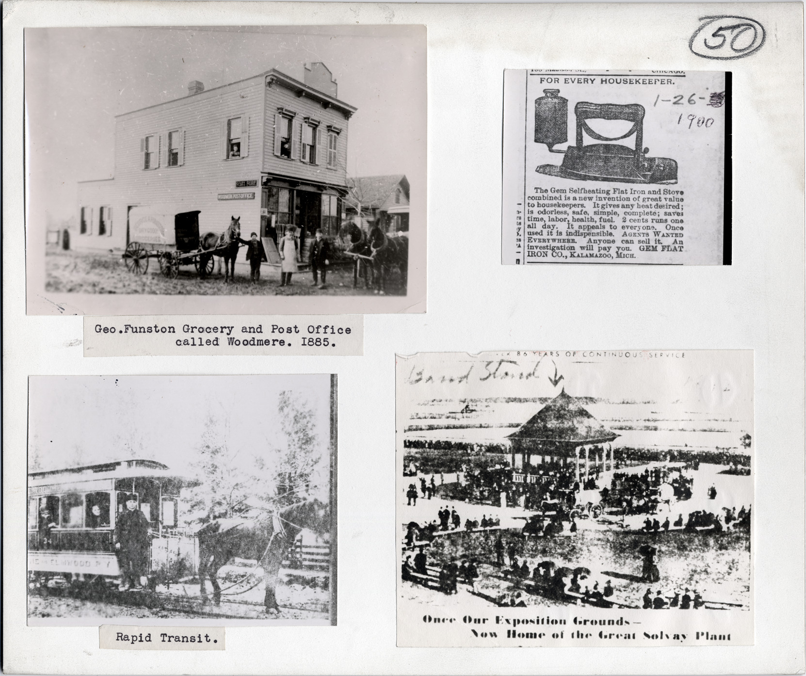 Four photographs on mat board of businesses and services in Delray including Geo. Funston Grocery and Woodmere post office; horse-drawn streetcar; crowd at Detroit International Fair and Exposition, printed on image, "Once our exposition grounds, now home of the great Solvay Plant; ad for the Gem selfheating flat iron. Typed on front of photos: "Geo. Funston Grocery and post office called Woodmere, 1885; Rapid transit."