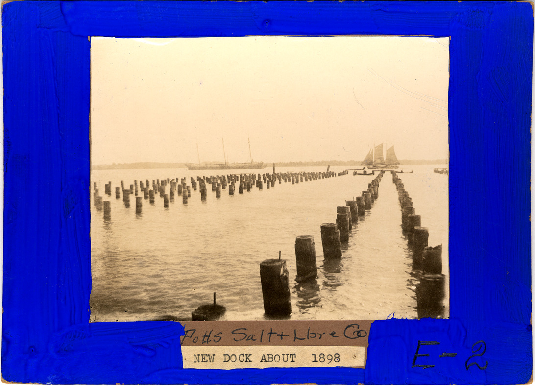 Piles for new dock for Potts Salt and Lumber Co. in Delray neighborhood of Detroit. Double-masted boat under sail and triple-masted ship with no sail set beyond piles. Tan mat which was later painted blue. Handwritten on mat front: "Potts Salt & Lbre Co; E2." Typed on label on mat front: "New dock about 1898."
