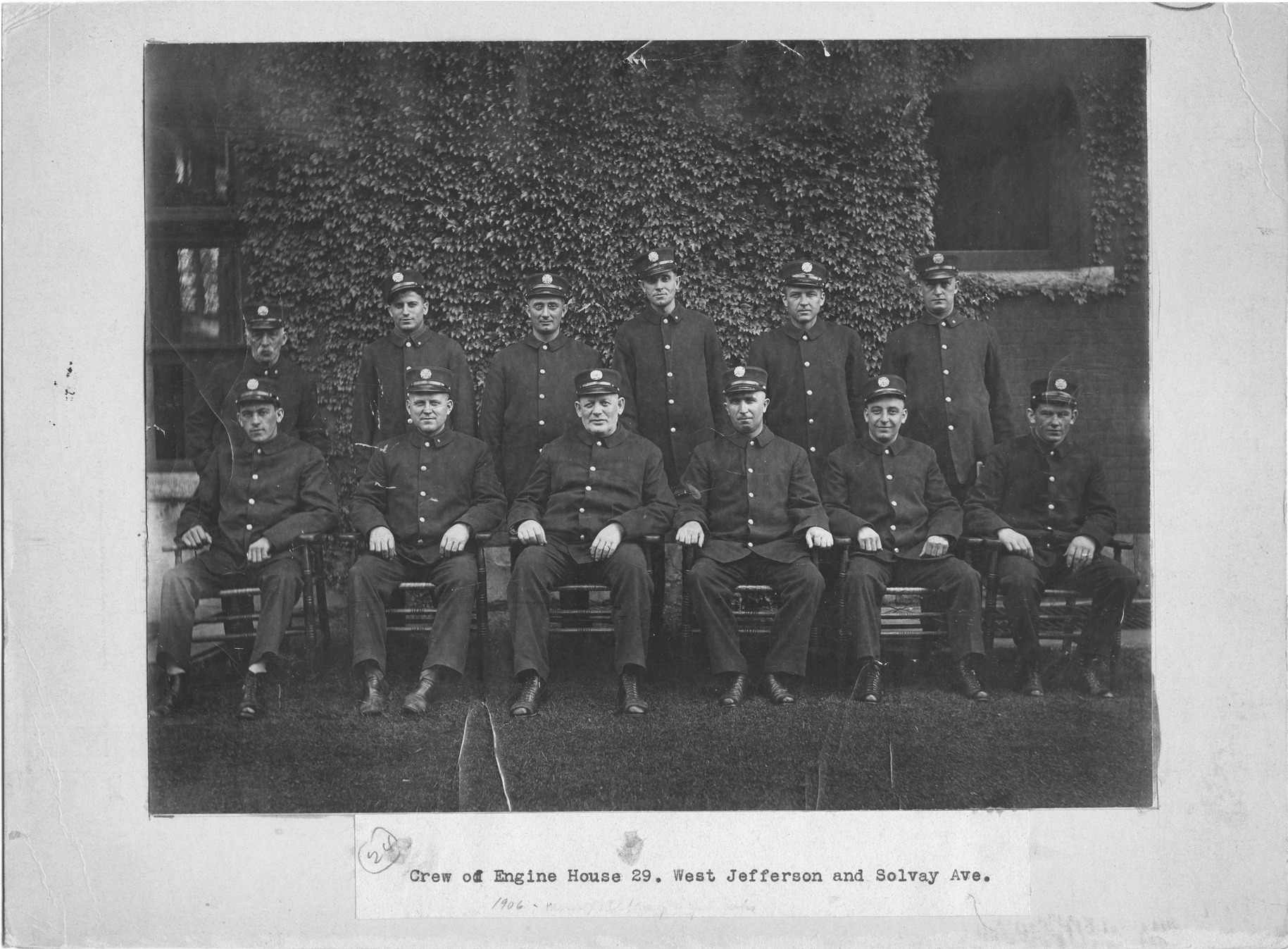 Favorite this☆ Portrait of Delray Engine House 29 fire fighters Description: Group portrait of the uniformed members of Delray's Engine House 29. Typed on front of photo: "Crew of Engine House 29, West Jefferson and Solvay Ave." Details Resource ID: DPA0161 Subject: Fire fighters--Michigan--Detroit Portraits, Group Photographic prints Date Issued: Unknown year Format: 1 photographic print mounted on mat board ; image 7.25 x 9.5 in. Member of: Burton Historical Collection Filing Location: M/Localities-Delray Rights: Physical rights are retained by DPL. Copyright is retained in accordance with U.S. copyright laws.