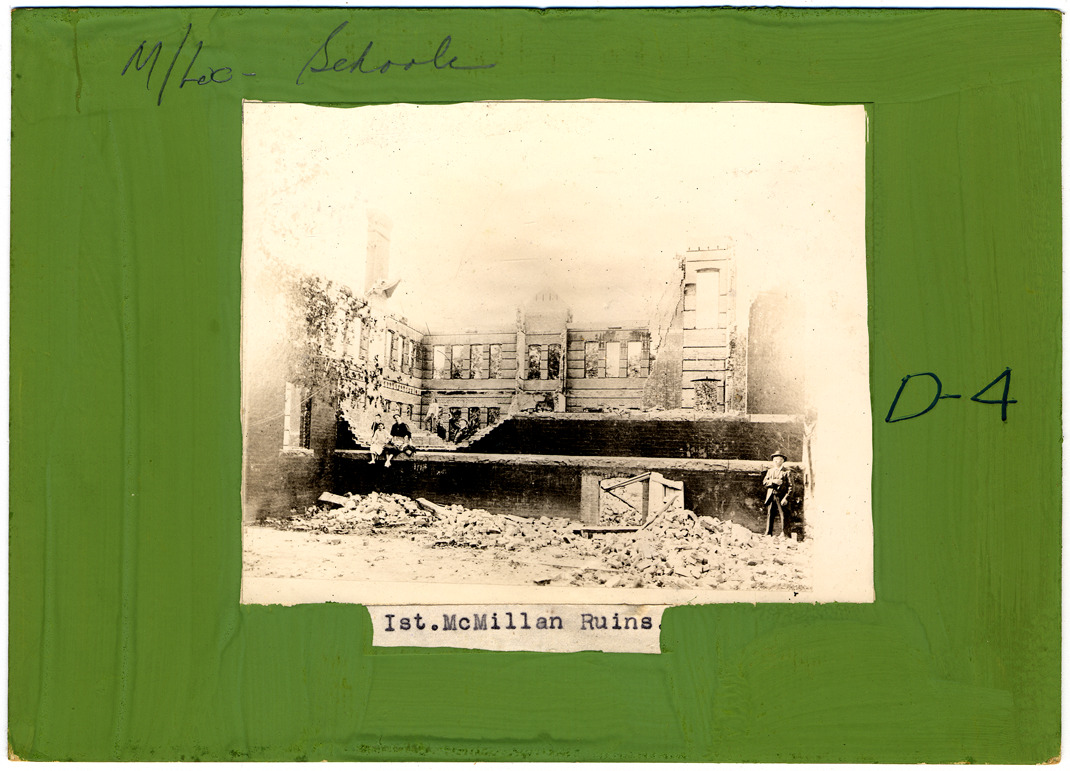 Brick schoolhouse in process of demolition; one man standing in front of building, several people standing and sitting on first floor. Photograph mounted on mat later painted green. Handwritten on mat front: "D-4." Typed on label on mat front: "Ist. McMillan Ruins."