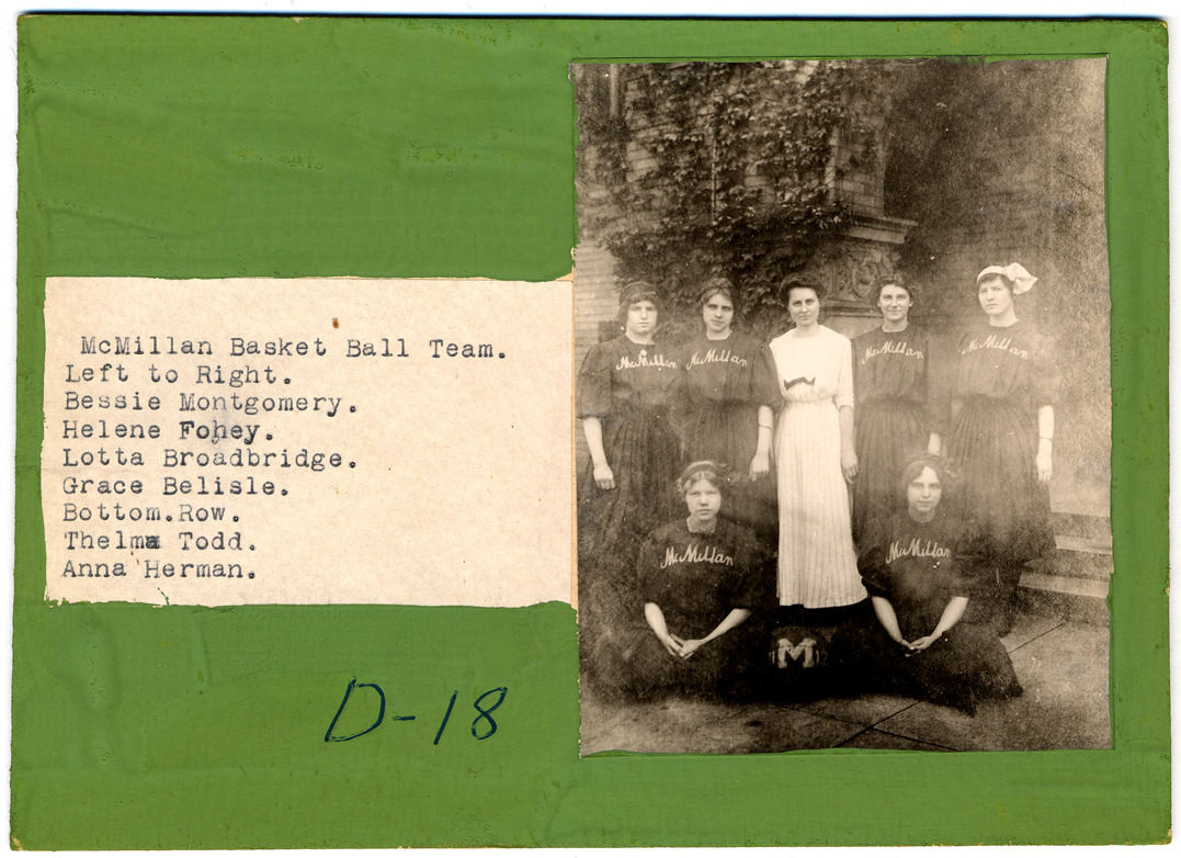 Girls' basketball team, McMillan School, Springwells Twp. Photograph mounted on mat later painted green. Handwritten on mat front: "D-18." Typed on label on mat front: "McMillan Basket Ball Team / Left to Right: Bessie Montgomery, Helen Fohey, Lotta Broadbridge, Grace Belisle, Bottom Row: Thelma Todd, Anna Herman."