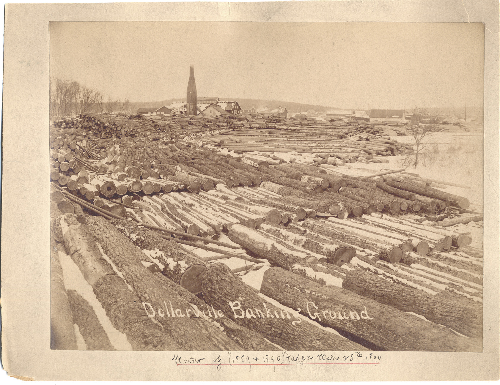 View of logs stacked in front of the Dollarville Mill in Dollarville, Michigan. Printed on front: "Dollarville banking ground." Handwritten on front: "Winter of 1889 & 1890, taken Mch. 25th 1890."