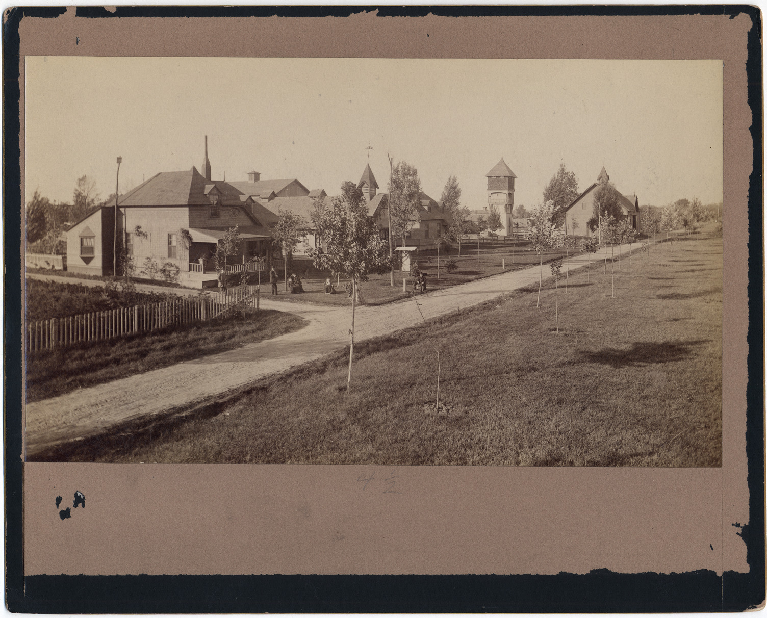View of unpaved street with residential and other buildings. Several people in yard in front of closest house. Newly-planted trees on both sides of street. Handwritten on back: "Autrovolo[?] Street, at Clairevue Stock Farm, Grosse Pointe." Stamped on back: "From Alvord & Co., exclusively, commercial photographers, 55 Rowland St. Detroit, Mich., ground floor."
