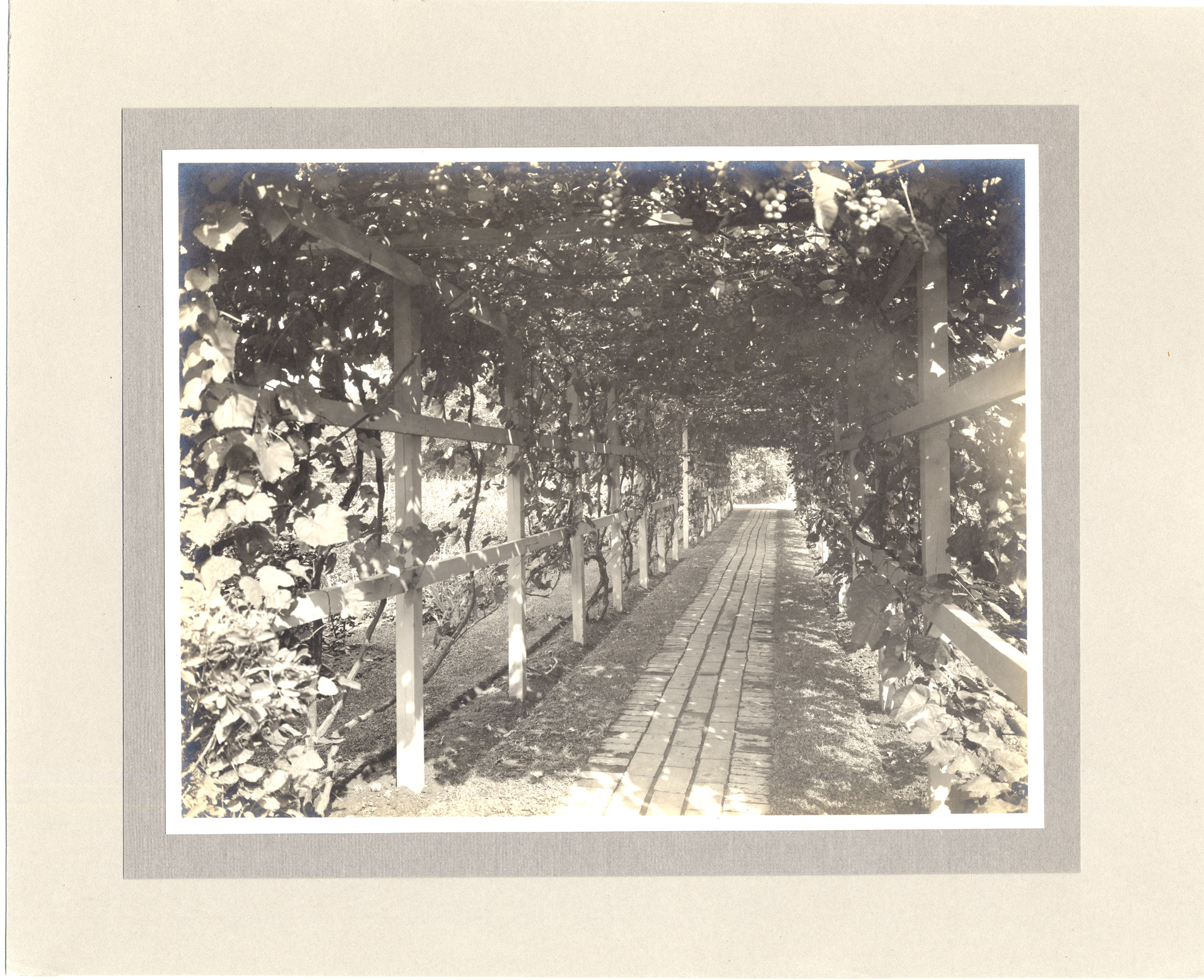Favorite this☆ Vine-covered arbor at Russell A. Alger house in Grosse Pointe Description: Grape arbor shading brick-paved path in Alger house garden. Details Resource ID: DPA0260 Subject: Alger, R.A. (Russell Alexander), 1836-1907--Homes and haunts--Michigan--Grosse Pointe Gardens--Michigan--Grosse Pointe Arbors--Michigan--Grosse Pointe Albumen prints Photographic prints Date Issued: Unknown year Format: 1 photographic print mounted on mat board ; image 7.25 x 9.25 in. Member of: Burton Historical Collection Filing Location: M/Localities-Grosse Pointe Rights: Physical rights are retained by DPL. Copyright is retained in accordance with U.S. copyright laws.