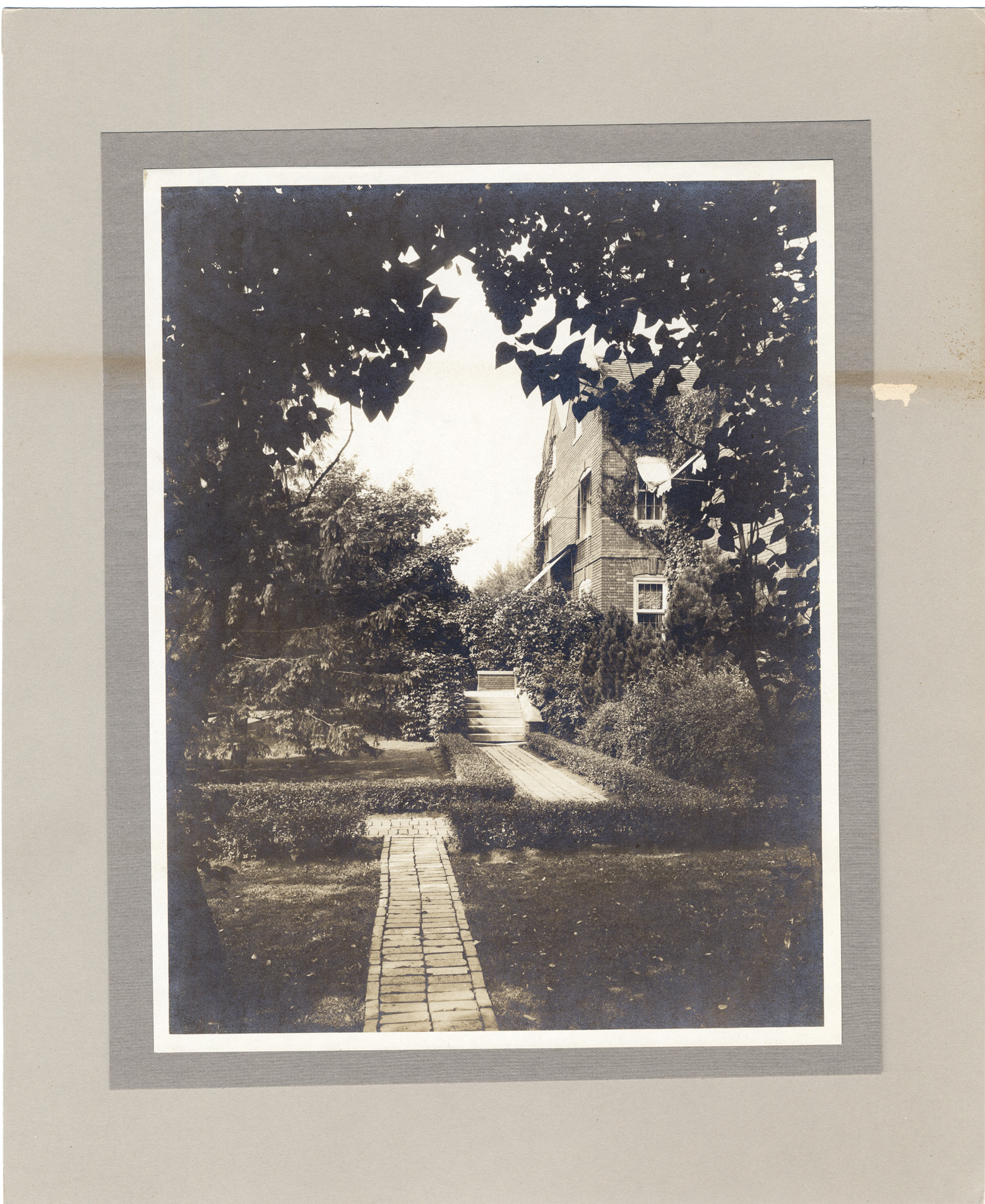 Paved paths and stairs through shrubbery and lawn leading to view of brick house. View is framed by leafy branches.