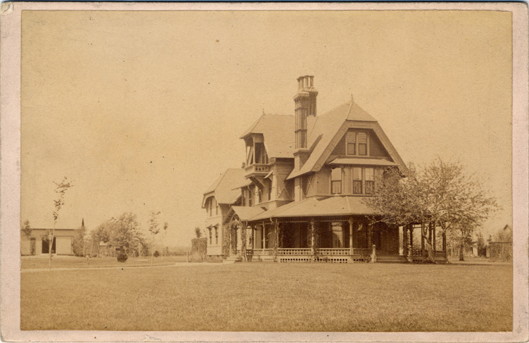 View of the Henry Brockholst Ledyard residence, a three story Queen Anne style home in Grosse Pointe. Written on photo back: "Grosse Pointe, 1886."