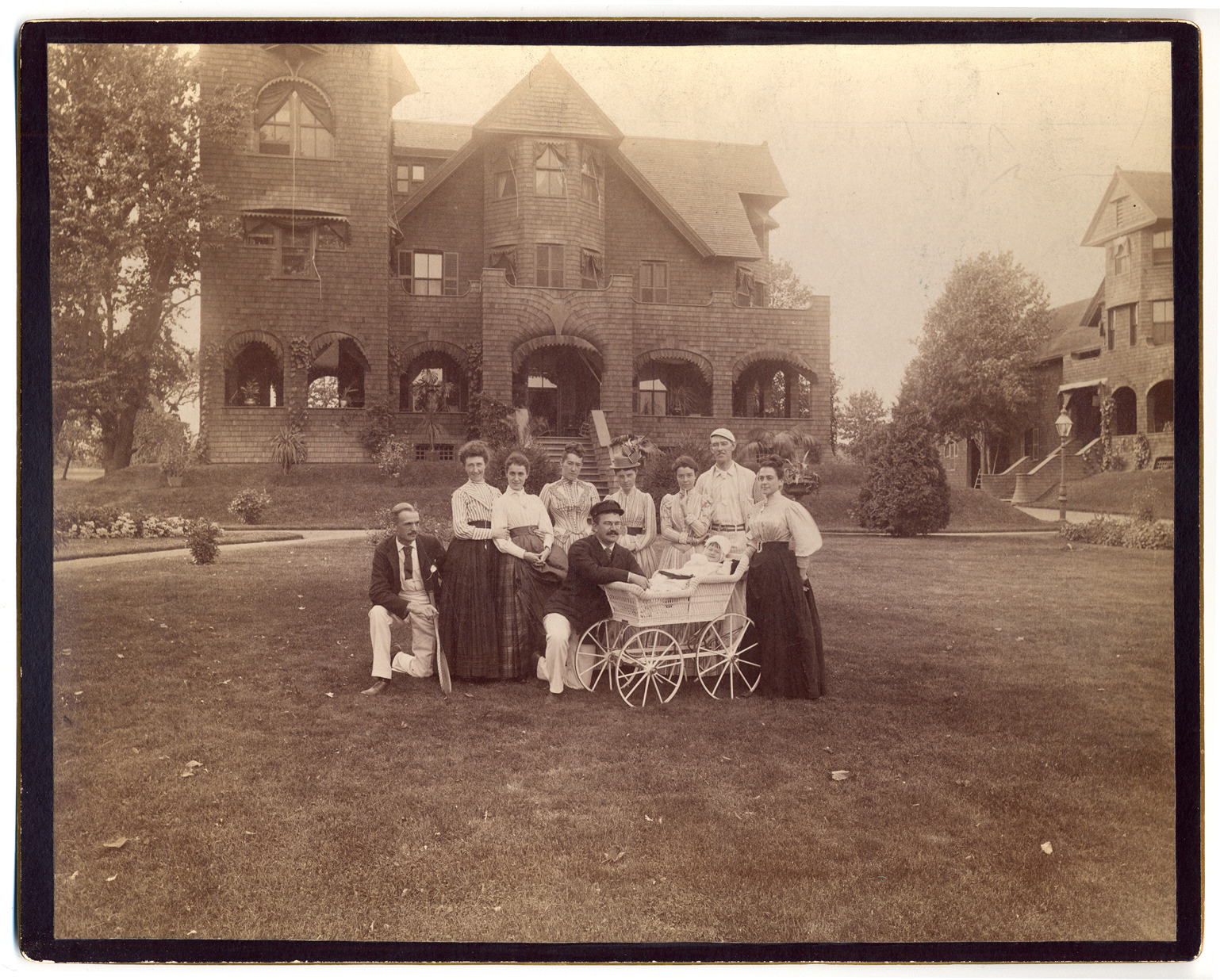 Six women, three men, and baby in wicker carriage in front of Shingle style house set on small artificial rise among trees, with another similar house partially visible to the right. Handwritten on back: "Mrs. John S. Newberry's residence, Grosse Pointe Farms, Mich. Mr. & Mrs. Truman H. Newberry & babe in extreme front." Printed on back: "Tomlinson, photographer, 236 Woodward Ave., Detroit, Michigan."