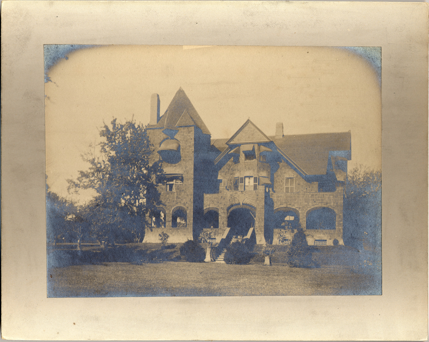 Shingle style house set on small artificial rise among trees. Handwritten on back: "John S. Newberry residence (3d) 'Lake Terrace.' Stood at present day 99 Lakeshore Road. Was destroyed in 1914."