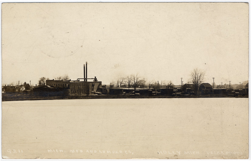 View of the Michigan Manufacturing and Lumber Co. in Holly, Michigan. Printed on front: "Michigan Mfg. and Lumber Co., Holly, Mich., Pesha photo."
