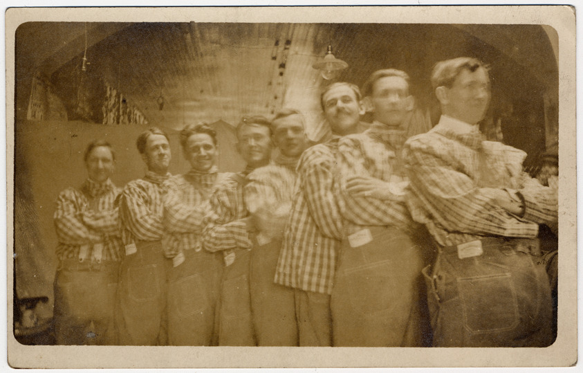 Group of men in costume of checkered shirts and dungarees with their arms folded across their chests, stand in a line, in building with high rounded wooden ceiling in Holly, Michigan.