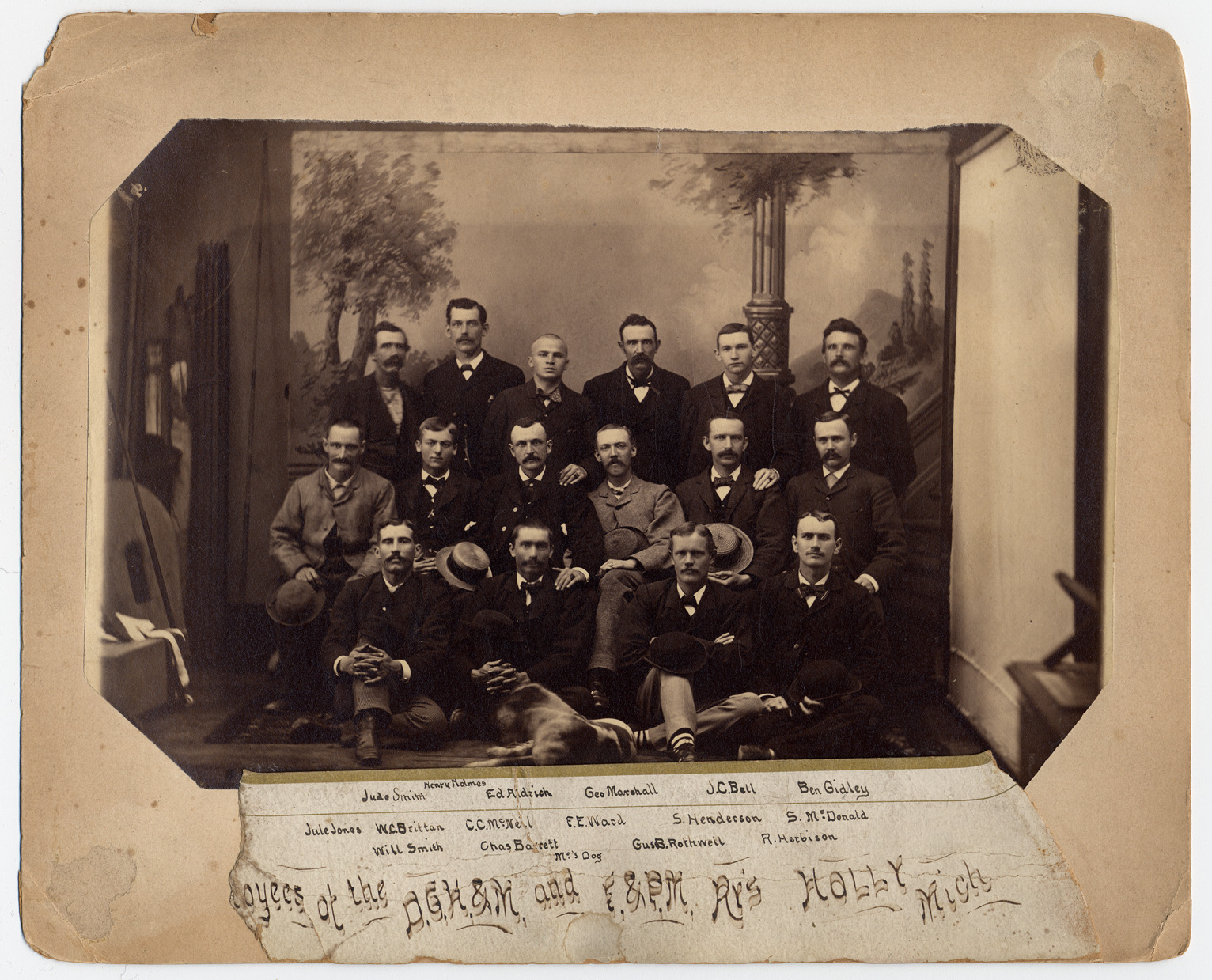 Railroad employees in Holly. Handwritten on label on mat front: "Jude Smith, Henry Holmes, Ed Aldrich, Geo Marshall, J.C. Bell, Ben Gidley, Jule Jones, W.C. Brittan, C.C. McNeil, F.E. Ward, S. Henderson, S. McDonald, Will Smith, Chas Barrett, Gus B. Rothwell, R. Herbison, Mc's dog, [Empl]oyees of the D.G.H.&M. [Detroit, Grand Haven & Milwaukee Railway: part of Grand Trunk Railway] and F.&P.M. [Flint & Pere Marquette] RR's Holly, Mich."