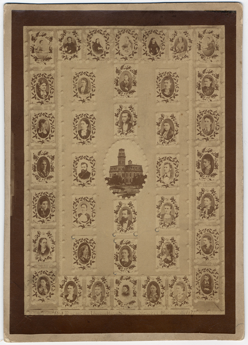 Montage of pictures of teachers at Howell's Union High School from 1868-1877. Picture of the school in the middle. Name written below each teacher's picture. At bottom of picture: "1868 Teachers Union High School Howell Mich. 1877." Handwritten on back: "1868 Teachers Union High School, Howell, Michigan 1877."