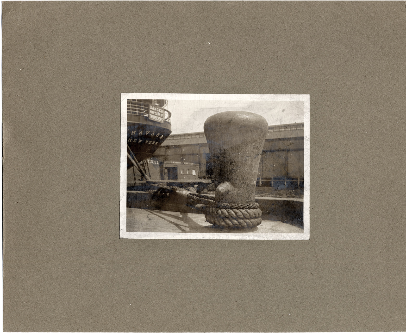 Lines from ship around bollard on dock. Written on stern of ship: "Havana, New York." Written on sign on railing: "Danger, keep clear of, twin screws." Written on building in background: "Lehigh Valley."