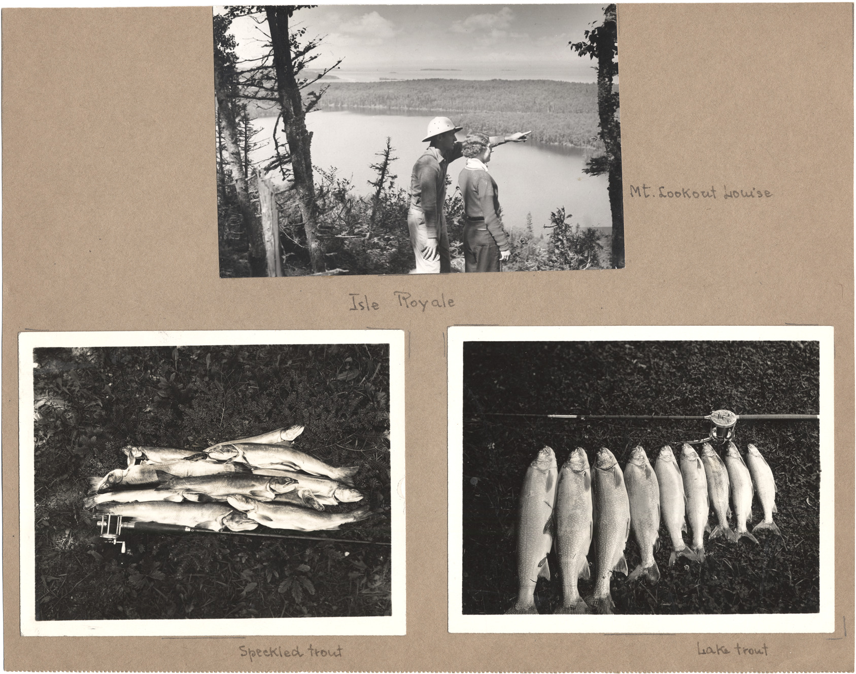 Three pictures mounted on one piece of stock. Man and woman on hill looking over water, man is pointing and is wearing pith helmet. Two strings of trout with fishing rods. Handwritten on mat: "Isle Royale-Mt. Lookout Louise-Speckled trout-Lake trout."
