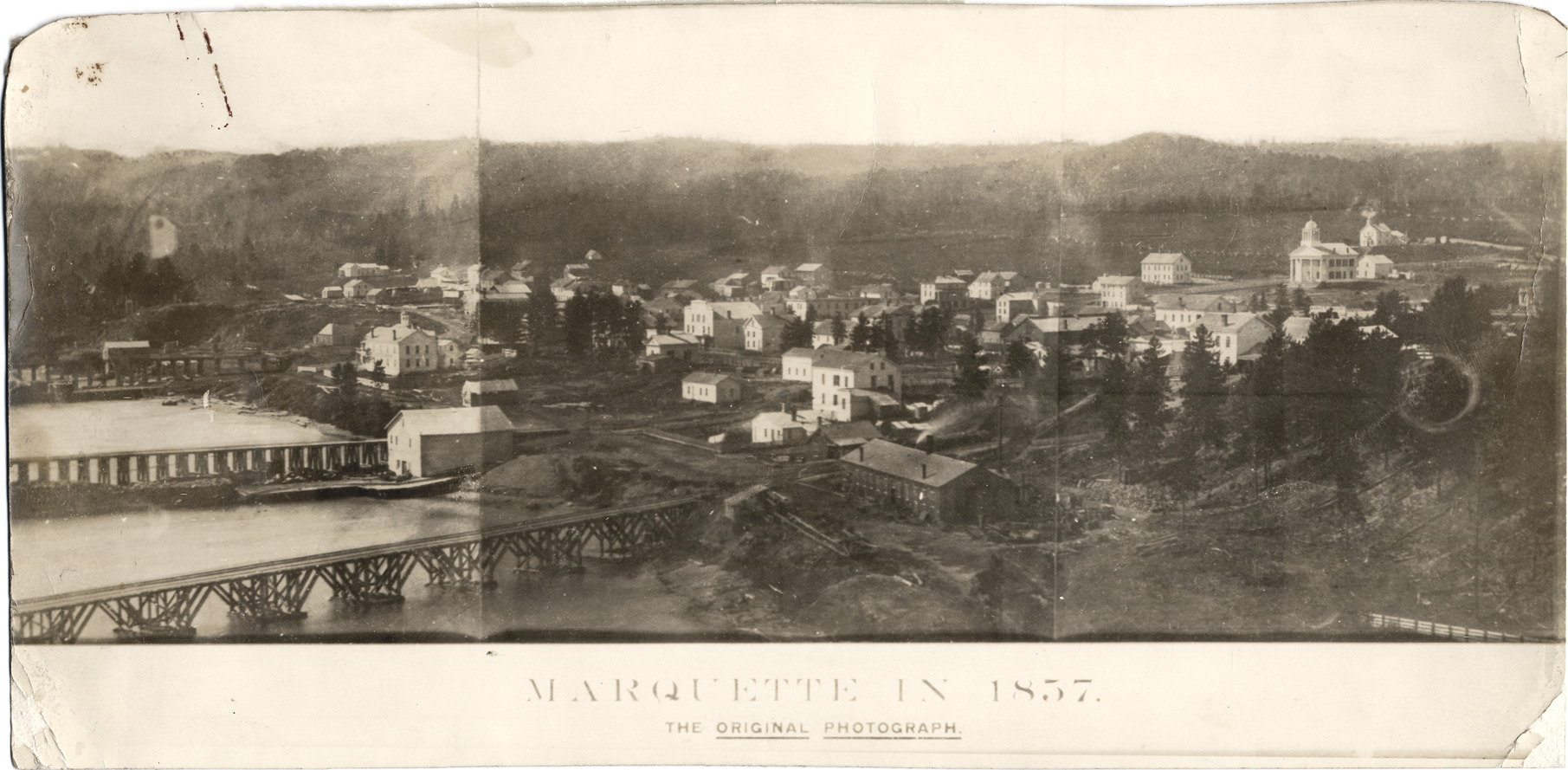 Panorama of Marquette made using three photographs. Printed on photograph front: "Marquette in 1857, the original photograph." Handwritten on back: "This picture was probably not taken until 1858, since there is nothing to indicate that the old court house, shown here, was completed until the spring or summer of 1858."